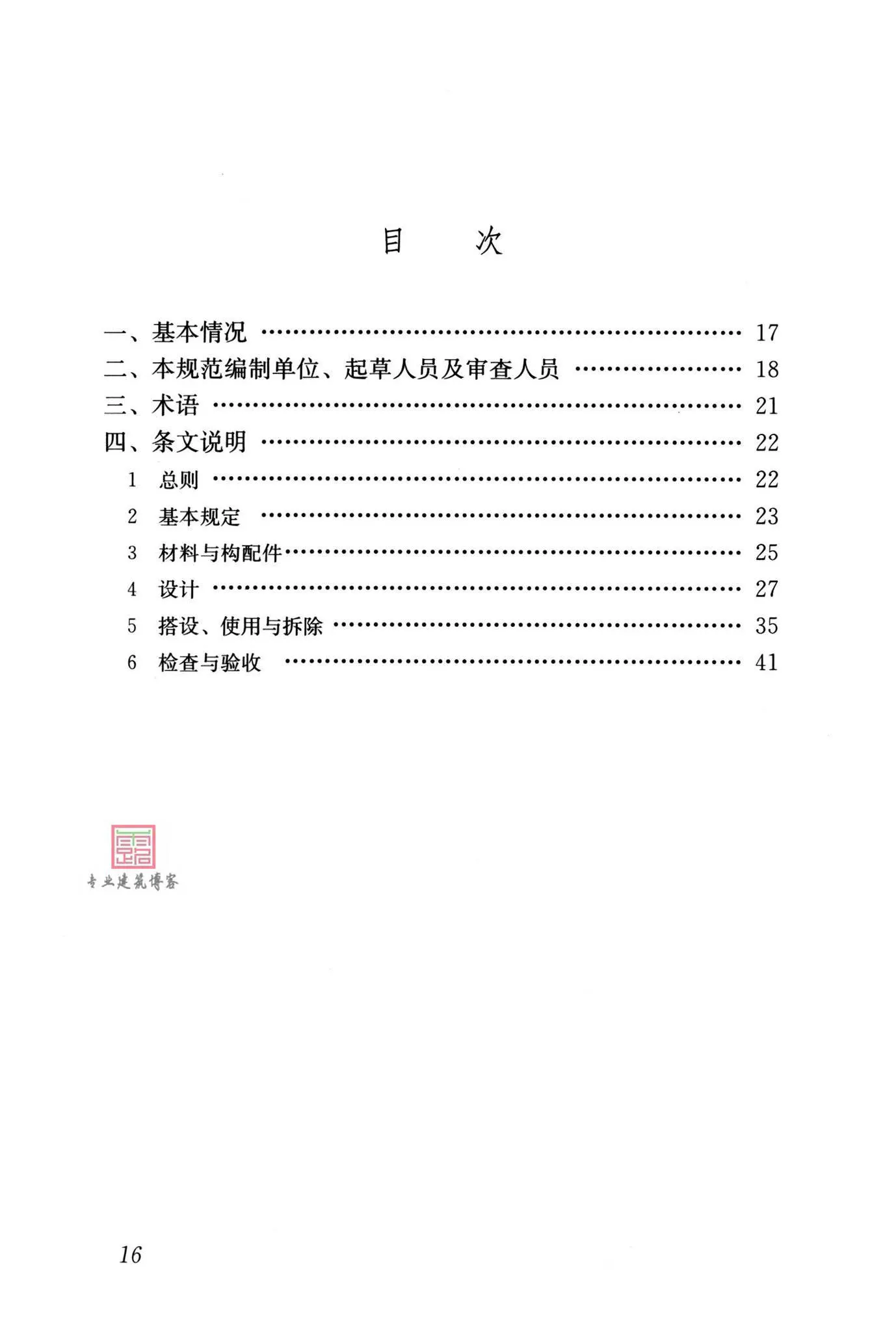 本标准包括:1、总则;2、基本规定;3、材料与构配件;4、设计;5、搭设、使用与拆除;6、检查与验收等。