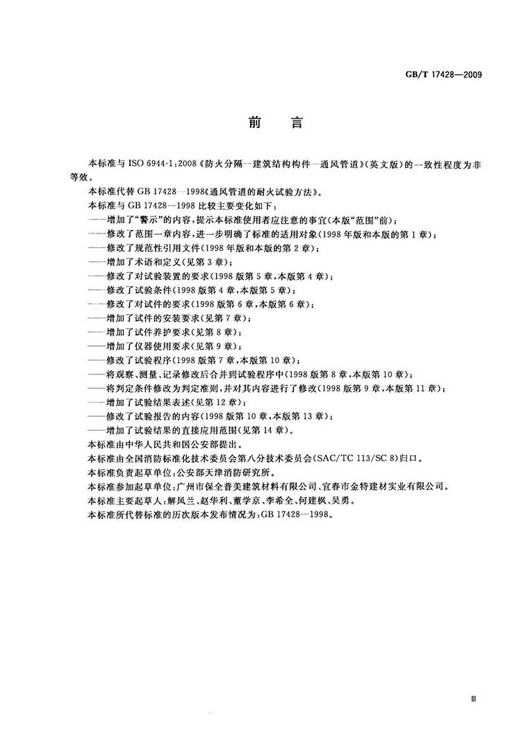 GB/T17428-2009《通风管道耐火试验方法》,替代GB17428-1998,2009年10月30日发布,2010年04月01日实施,中国标准出版社出版。