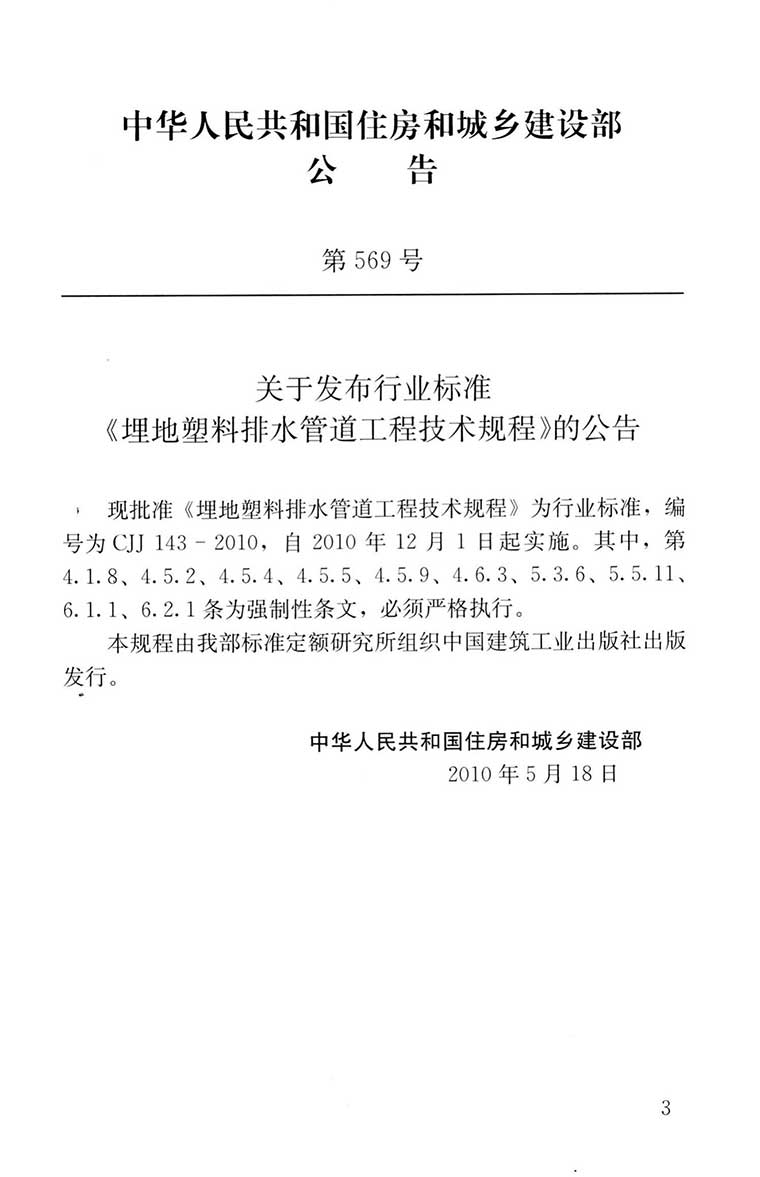 CJJ143-2010《埋地塑料排水管道工程技术规程》,2010年05月18日发布,2010年12月01日实施,中国建筑工业出版社出版。