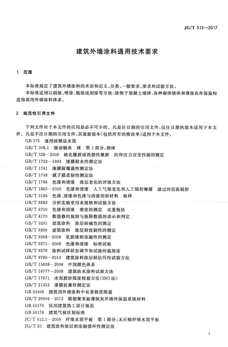 JG/T512-2017《建筑外墙涂料通用技术要求》,2017年03月20日发布,2017年09月01日实施,中国建筑工业出版社出版。