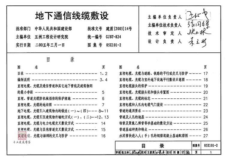 05X101-2《地下通信线缆敷设》,替代94X101-2,2005年01月25日发布,2005年03月01日实施,中国计划出版社出版。
