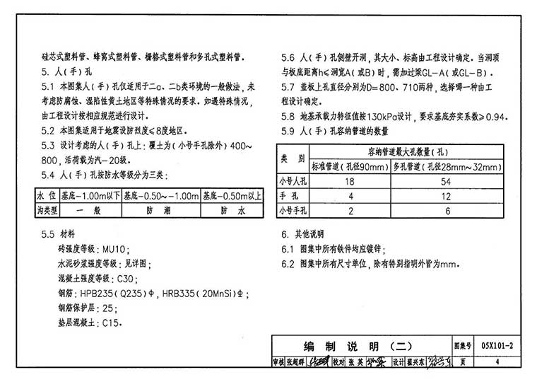 3、本图集保留了《地下通信线路安装》(94X101-2)图集中常用的小号人孔,取消了不常用的大号人孔。当工程需要采用中、大号人(手)孔时,人(手)孔做法见《通信管道人孔和管块组群图集》YDJ-101。