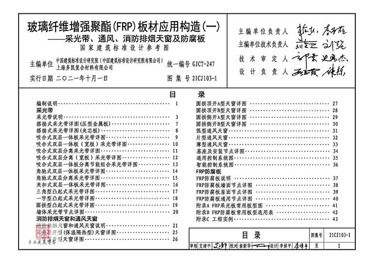 21CJ103-1《玻璃纤维增强聚酯(FRP)板材应用构造(一)——采光带、通风、消防》,2021年10月01日发布,2021年10月01日实施,中国标准出版社出版。