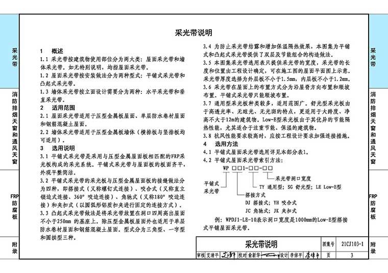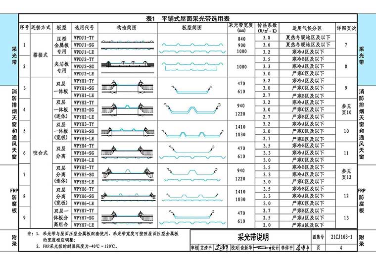 本图集仅在平铺式屋面采光带的选用代号中编入了三种功能性采光板的板型代号。墙体采光板、凸起式屋面采光带防腐板及排烟天窗的采光板均可选用上述三种不同功能性板材,但是选用代号中不体现,可在工程设计时用文字提出。