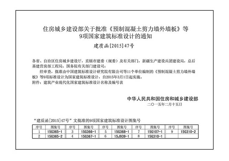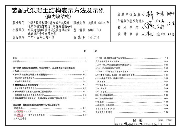 15G107-1《装配式混凝土结构表示方法及示例(剪力墙结构)》,2015年02月15日发布,2015年03月01日实施,中国计划出版社出版。