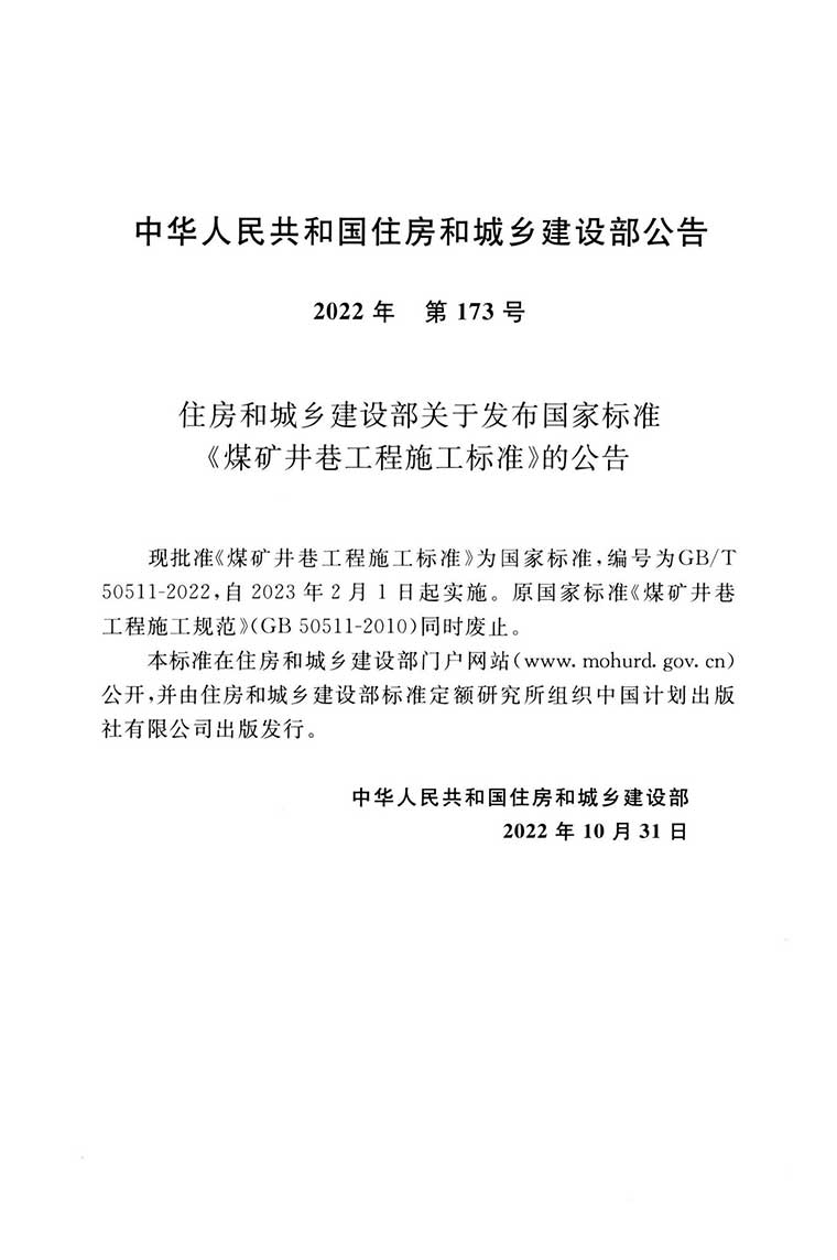 GB/T50511-2022《煤矿井巷工程施工标准》,替代GB/T50511-2010,2022年10月31日发布,2023年02月01日实施,中国计划出版社出版。