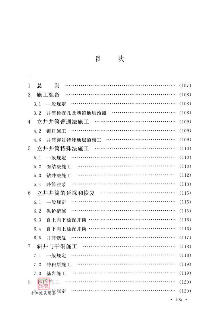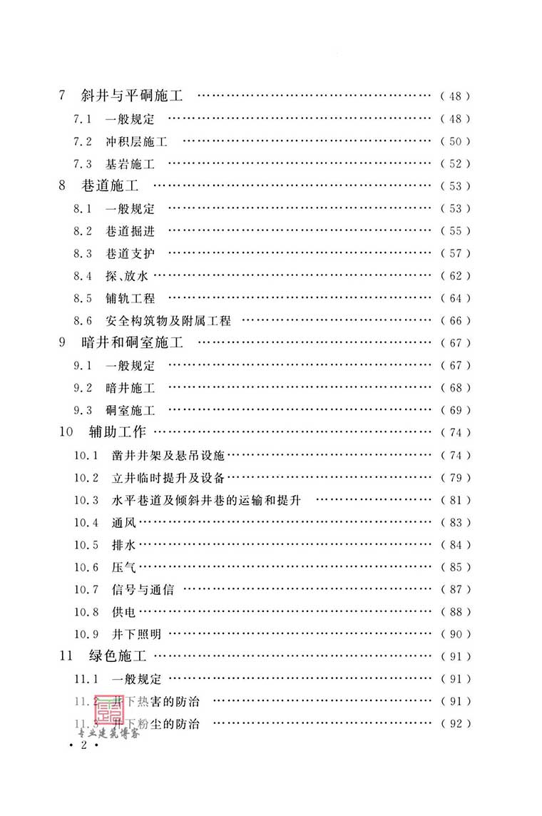 本标准主要技术内容:总则、术语、施工准备、立井井筒普通法施工、立井井筒特殊法施工、立井井筒的延深和恢复、斜井与平硐施工、巷道施工、暗井和硐室施工、辅助工作、绿色施工等。