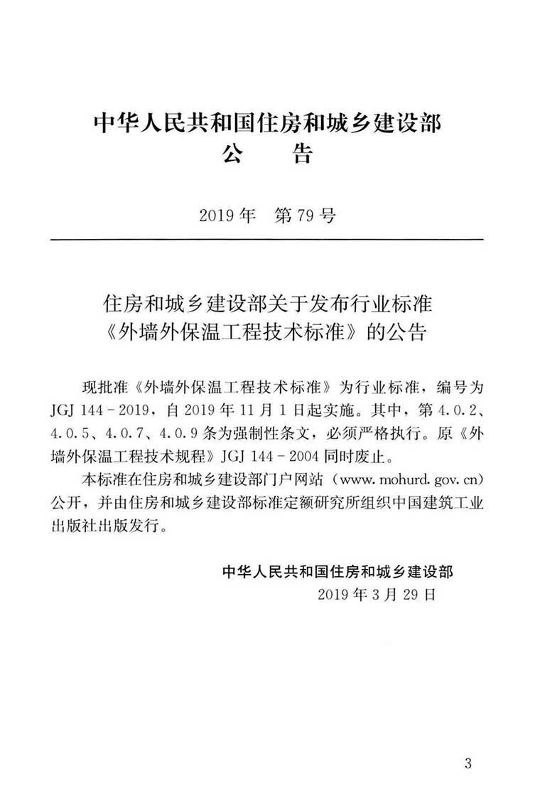 JGJ144-2019《外墙外保温工程技术标准》,替代 JGJ144-2004,2019年03月29日发布,2019年11月01日实施,中国建筑工业出版社出版。