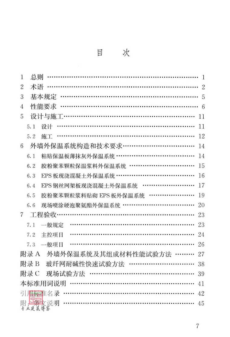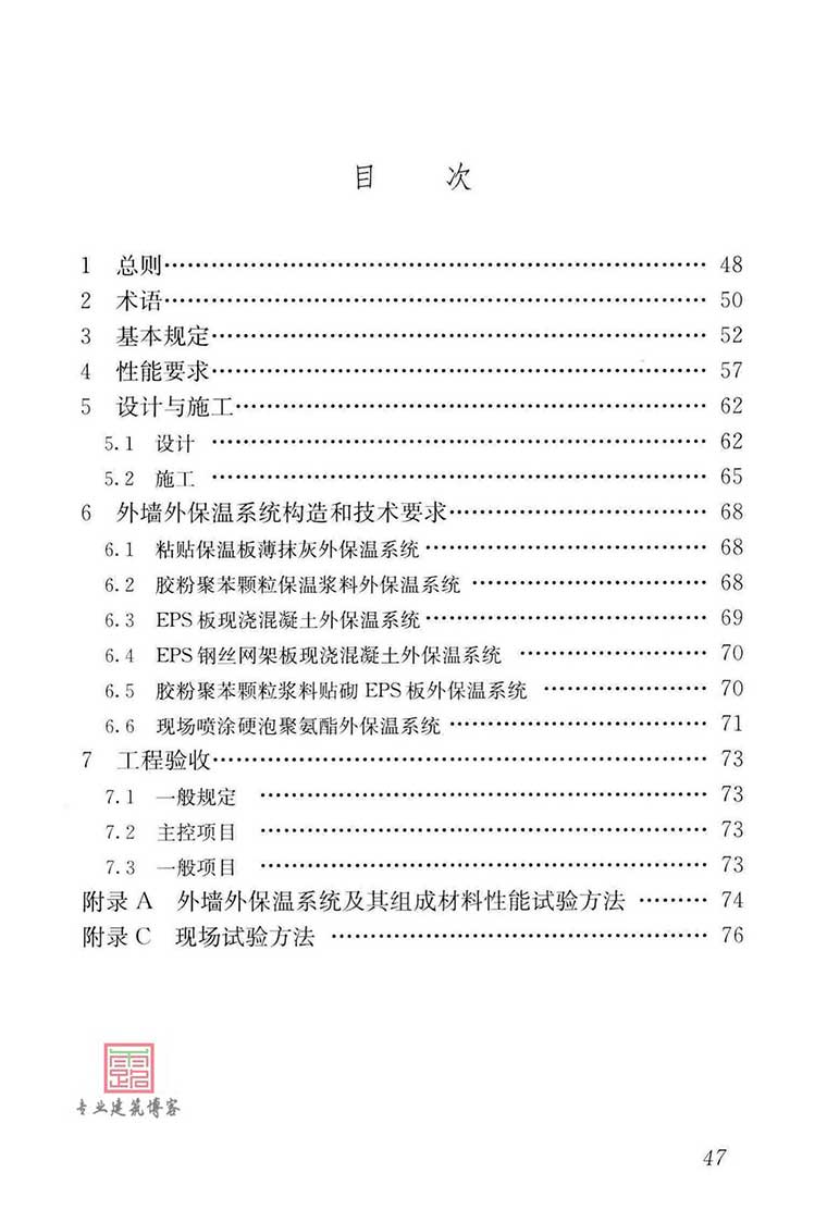 本标准的主要技术内容是:1、总则;2、术语;3、基本规定;4、性能要求;5、设计与施工;6、外墙外保温系统构造和技术要求;7、工程验收。