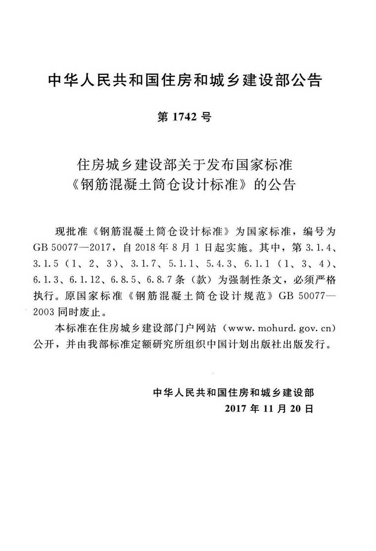 GB50077-2017《钢筋混凝土筒仓设计标准》,替代GB50077-2007,2017年11月20日发布,2018年08月01日实施,中国计划出版社出版。