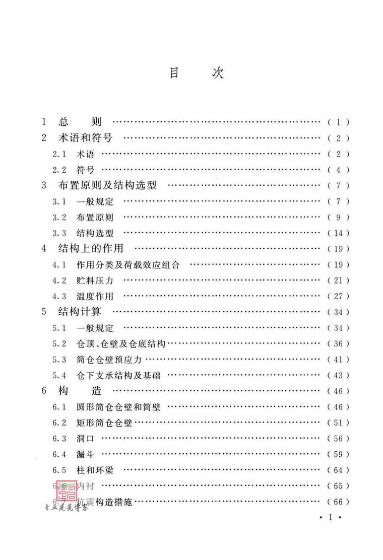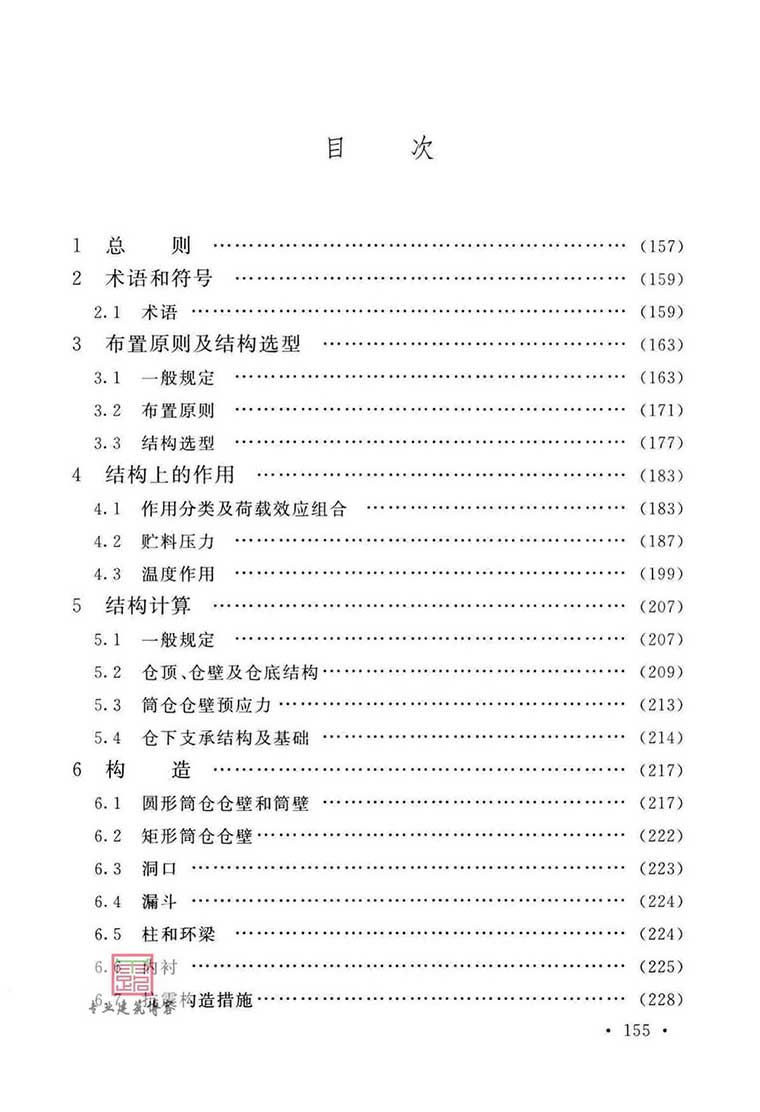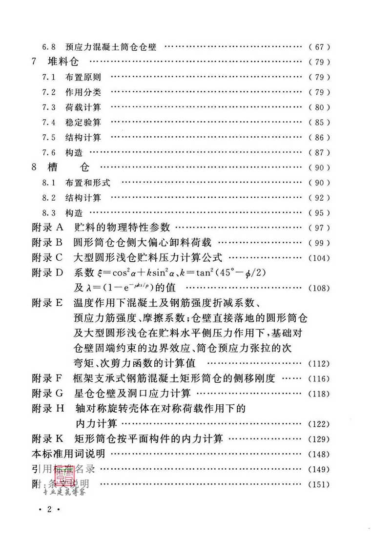 本标准共分8章和9个附录,主要内容包括:总则、术语和符号、布置原则及结构选型、结构上的作用、结构计算、构造、堆料仓、槽仓等。