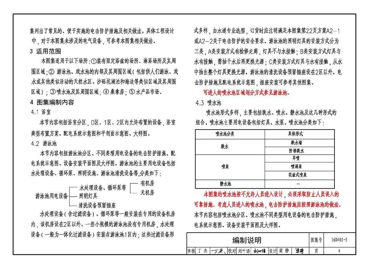 图集根据浴室、游泳池、喷水池和桑拿房的区域划分,明确各区域电气设备选择和布置要求。图集的编制可以解决潮湿场所(浴室、游泳池、喷水池和桑拿房等)电气设备的设计、选用和电击防护措施,其他潮湿场所的电气设计与施工可参考图集使用。