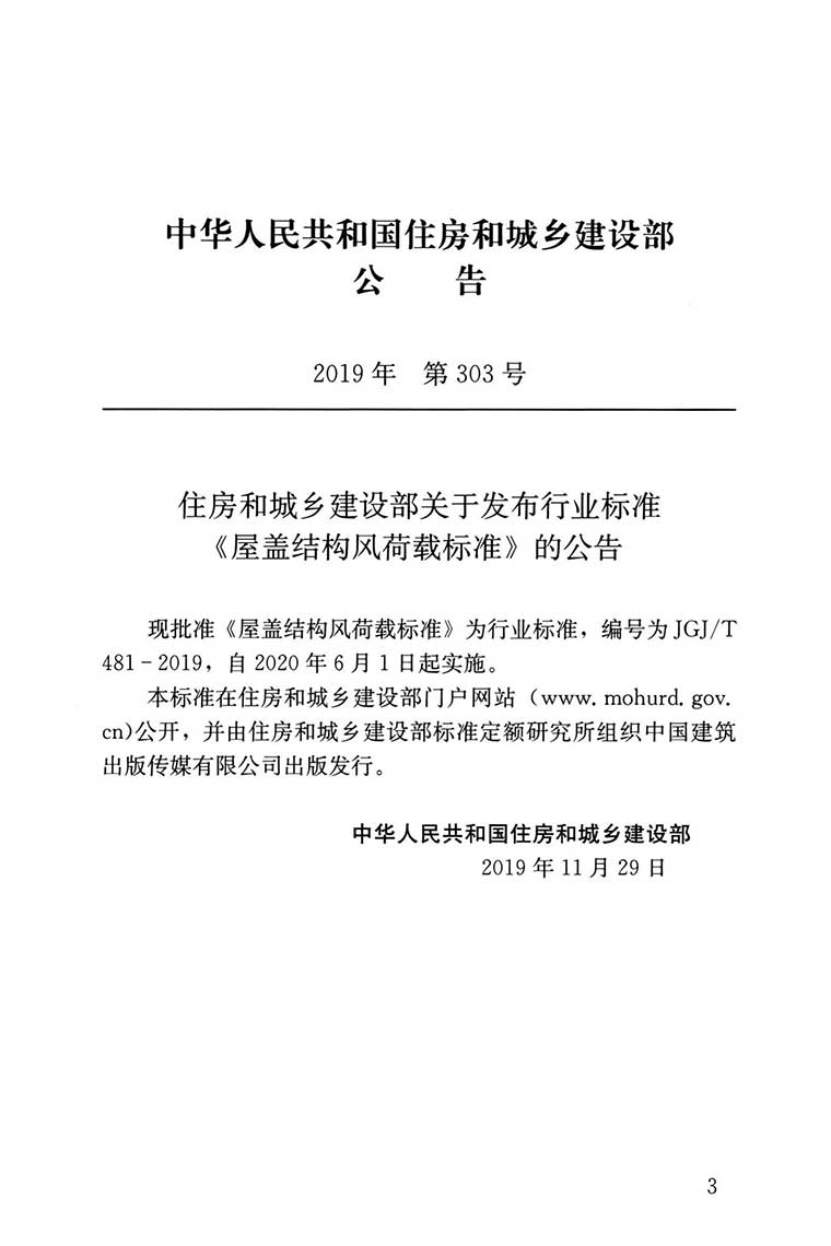 JGJ/T481-2019《屋盖结构风荷载标准》,2019年11月29日发布,2020年06月01日实施,中国建筑工业出版社出版。
