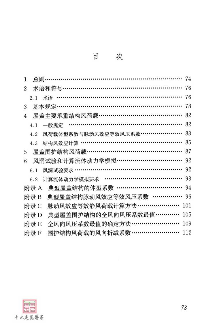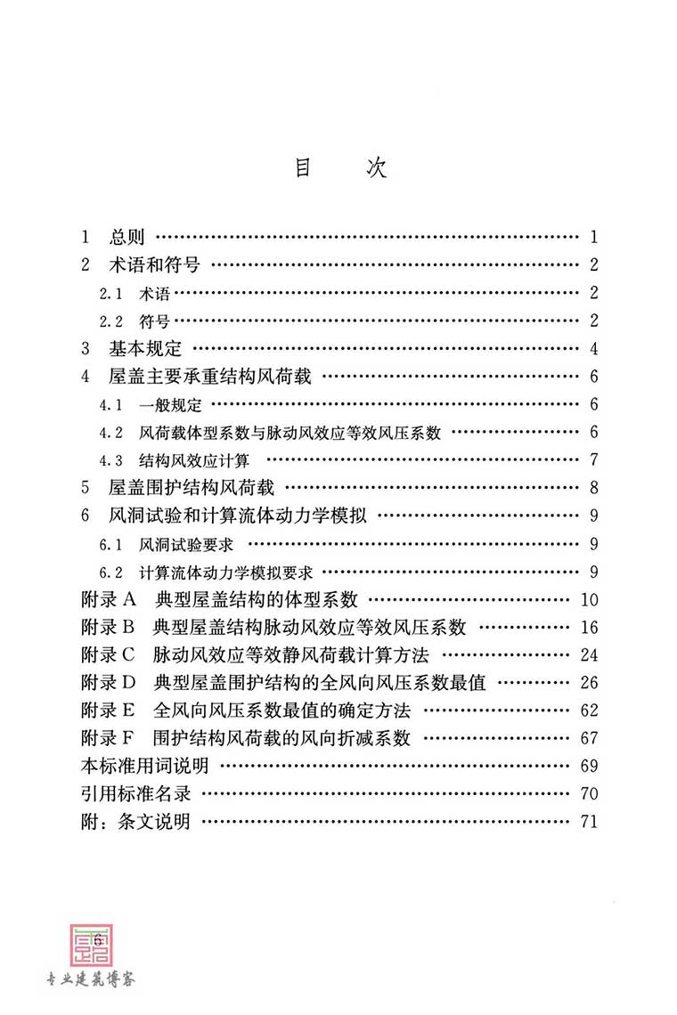 本标准的主要技术内容是:1、总则;2、术语和符号;3、基本规定;4、屋盖主要承重结构风荷载;5、屋盖围护结构风荷载;6、风洞试验和计算流体动力学模拟。