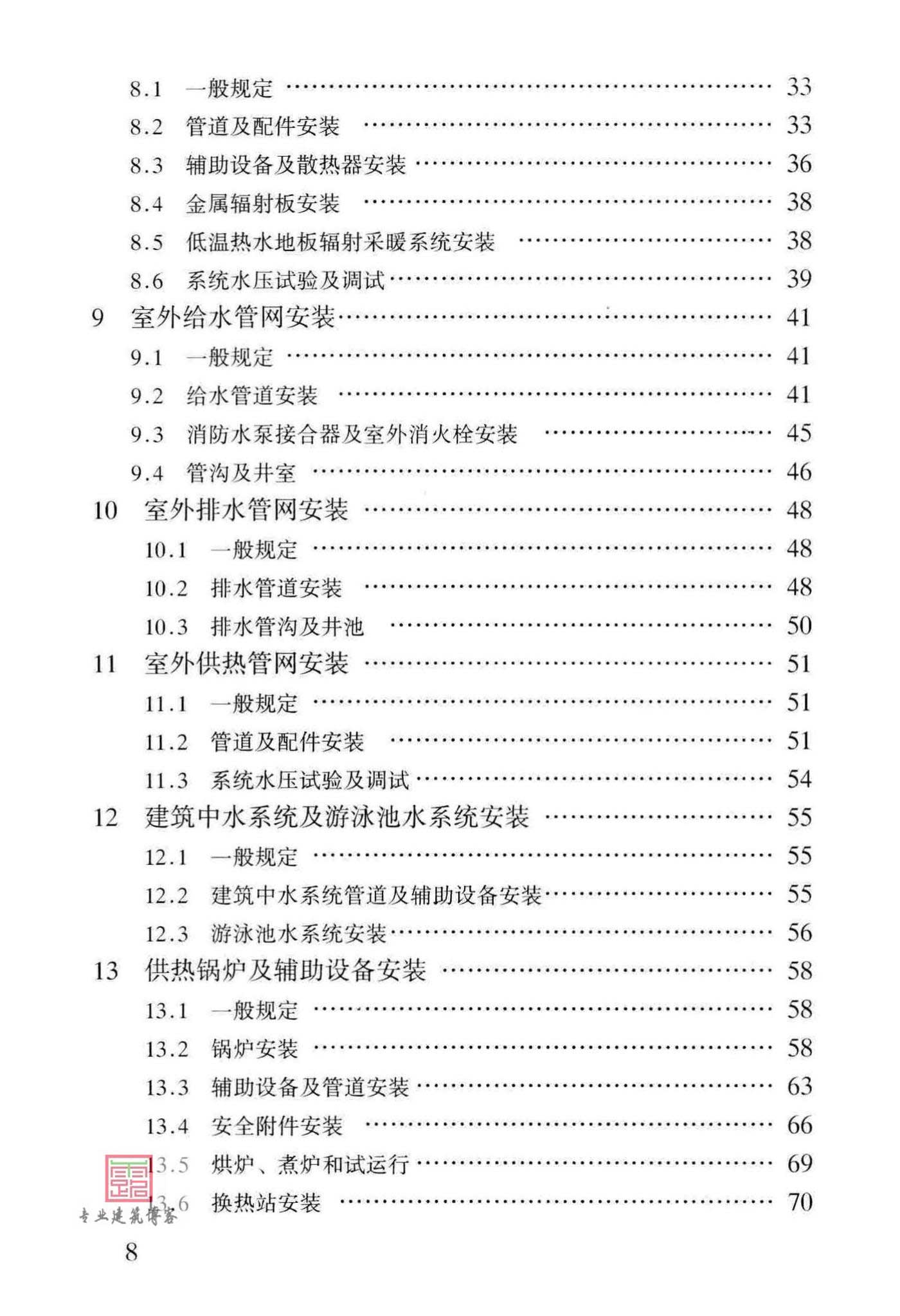 本规范主要技术内容包括:1、总则;2、术语;3、基本规定;4、室内给水系统安装;5、室内排水系统安装;6、室内热水供应系统安装;7、卫生器具安装;8、室内采暖系统安装;9、室外给水管网安装;10、室外排水管网安装;11、室外供热管网安装;12建筑中水系统及游泳池水系统安装;13、供热锅炉及辅助设备安装和14分部(子分部)工程质量验收,共14部分组成。