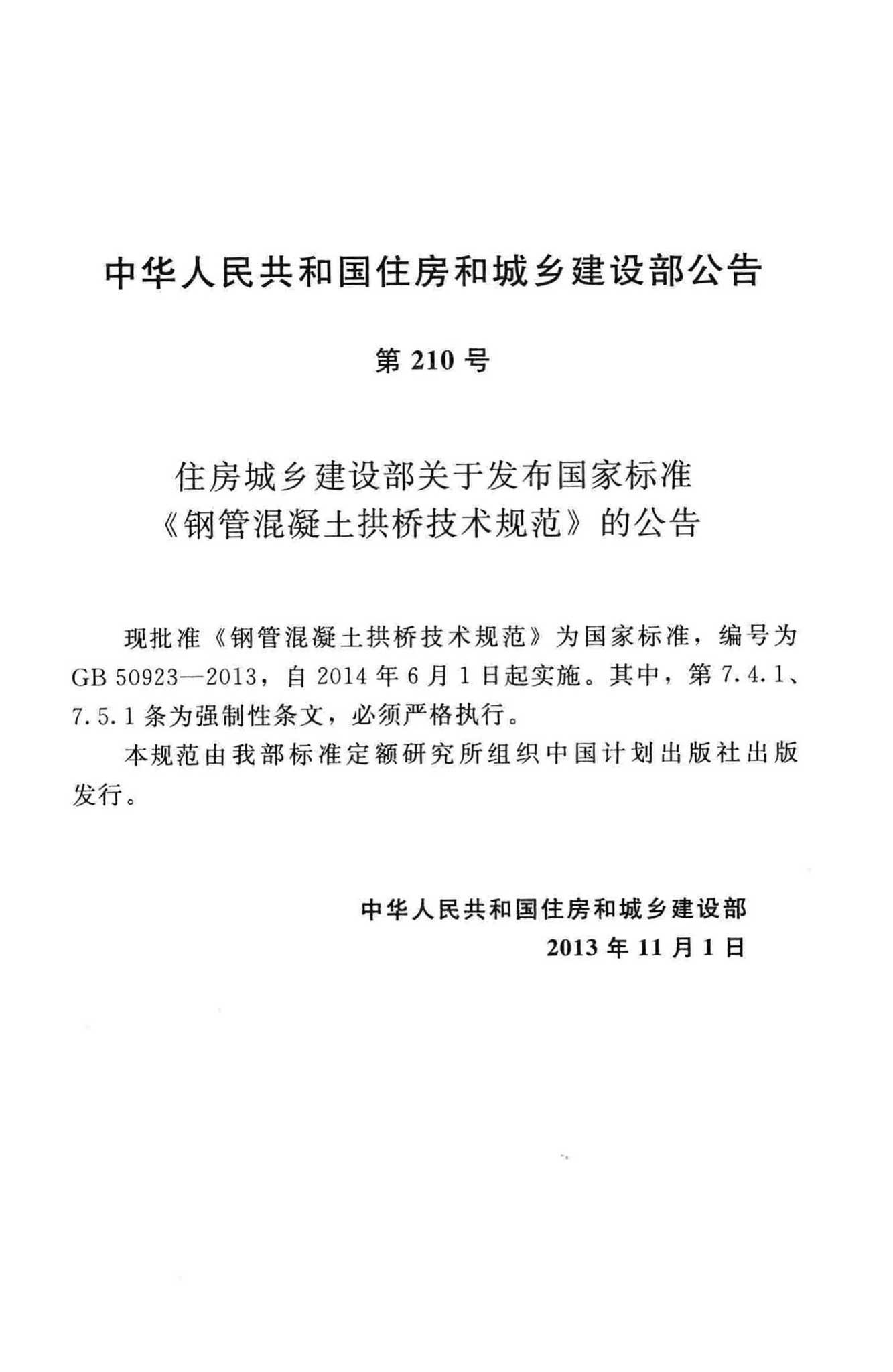 GB50923-2013《钢管混凝土拱桥技术规范》(含条文说明),2013年11月01日发布,2014年06月01日实施,中国计划出版社出版。