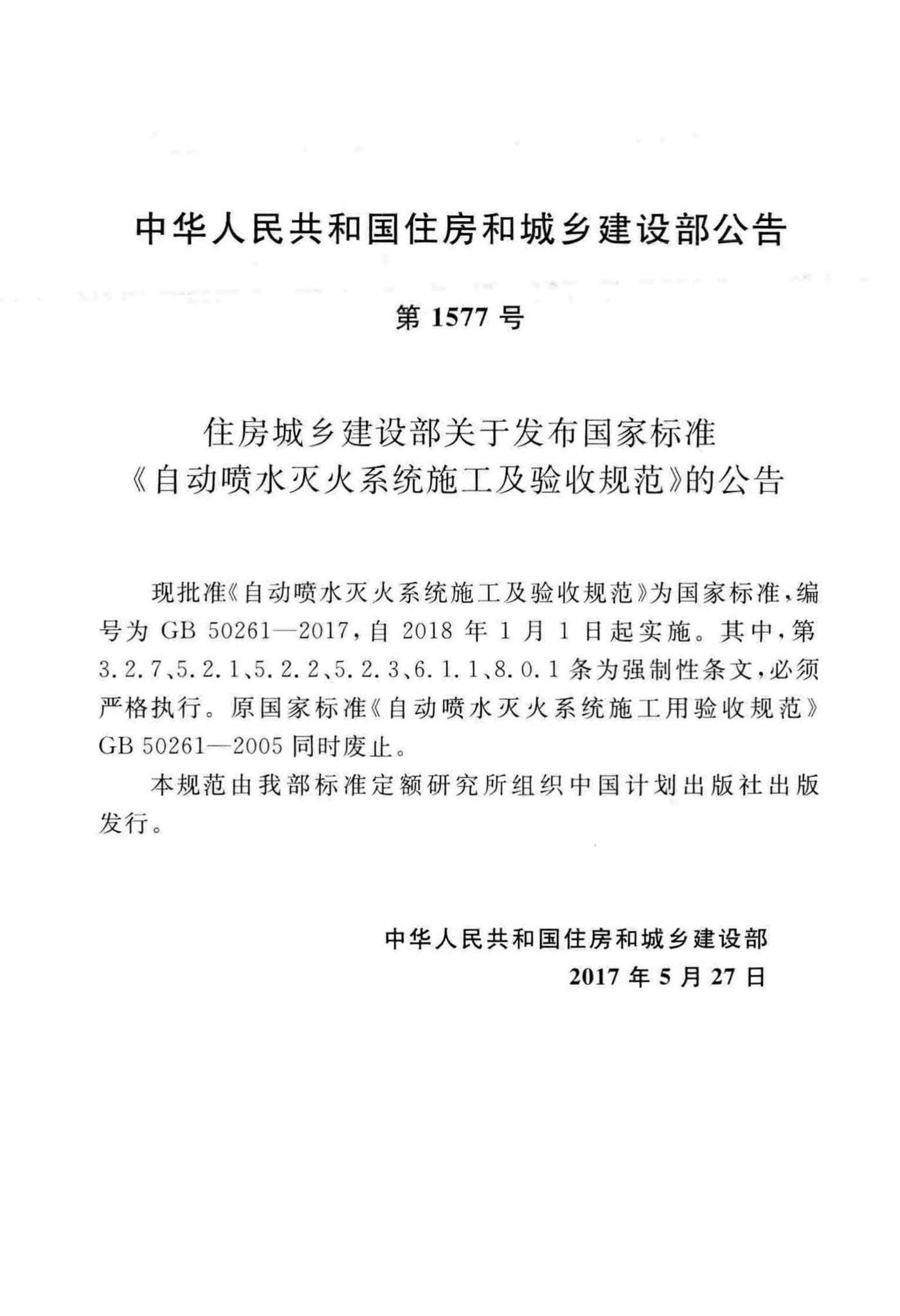 GB50261-2017《自动喷水灭火系统施工及验收规范》(含条文说明),替代GB50261-2005,2017年05月27日发布,2018年01月01日实施,中国计划出版社出版。