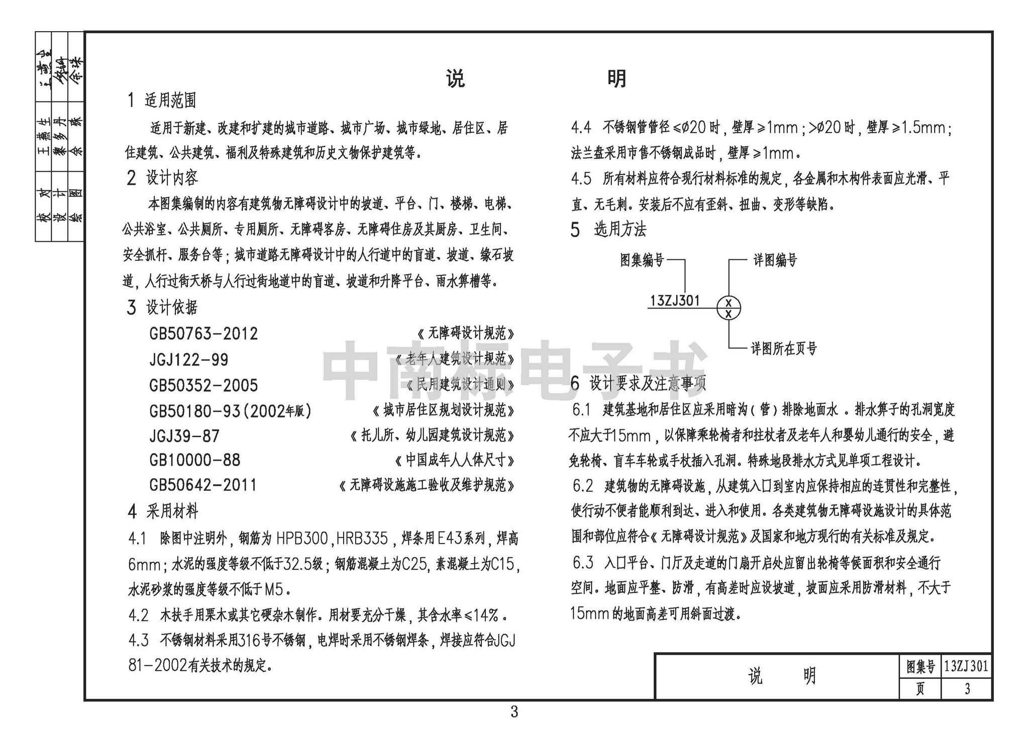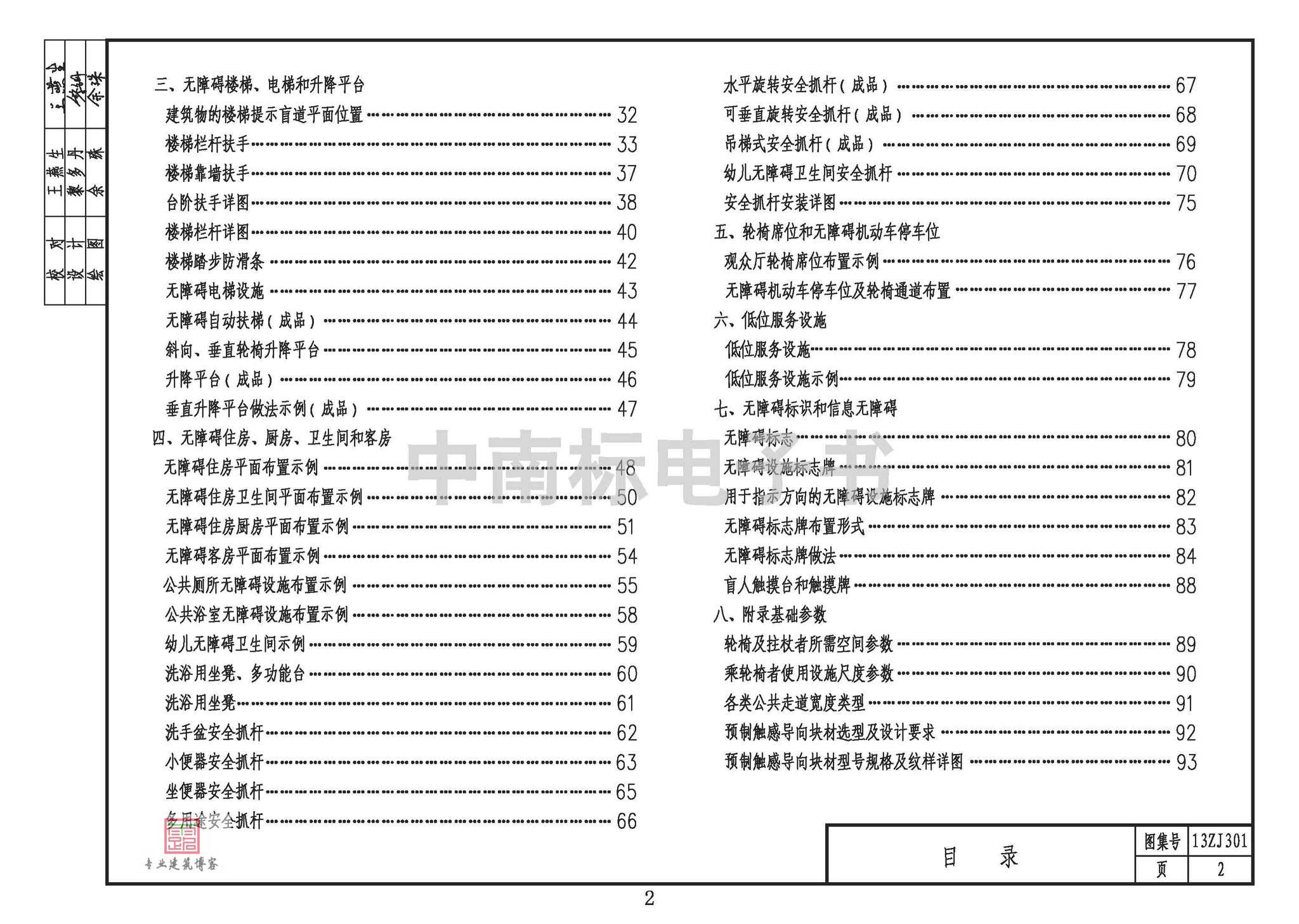 本图集编制的内容有建筑物无障碍设计中的坡道、平台、门、楼梯、电梯、公共浴室、公共厕所、专用厕所、无障碍客房、无障碍住房及其厨房、卫生间、安全抓杆、服务台等;城市道路无障碍设计中的人行道中的盲道、坡道、缘石坡道,人行过街天桥与人行过街地道中的盲道、坡道和升降平台、雨水算槽等。
