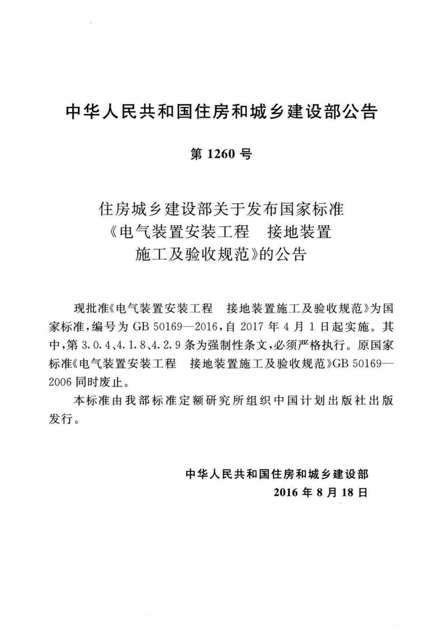 GB50169-2016《电气装置安装工程接地装置施工及验收规范》,替代GB50169-2006,2016年08月18日发布,2017年04月01日实施,中国计划出版社出版。