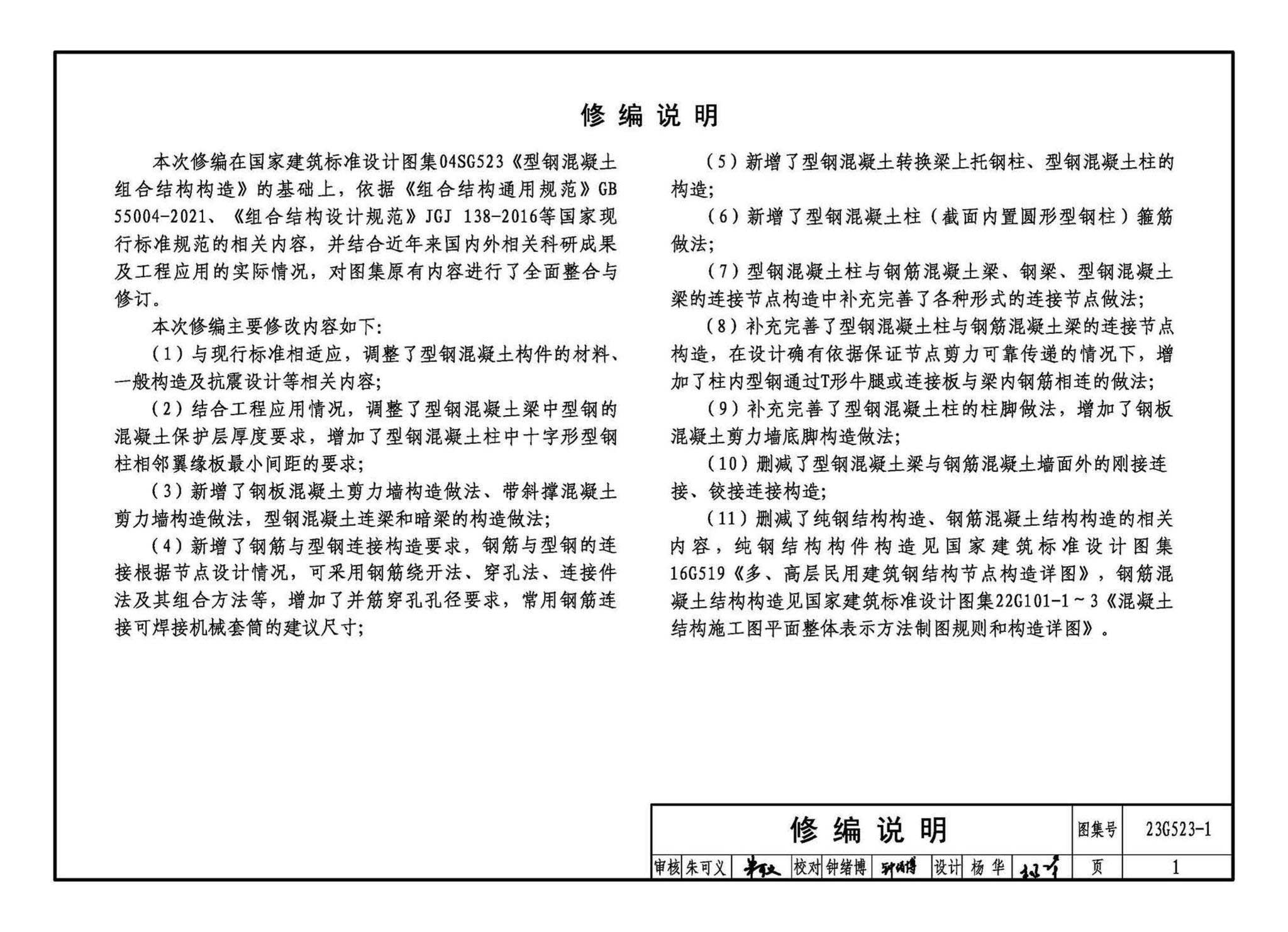 主要修编内容包括:调整了材料、保护层厚度要求等;增加了钢板混凝土剪力墙和带斜撑混凝土剪力墙构造、型钢混凝土连梁和暗梁构造、钢筋与型钢连接构造、型钢混凝土转换梁上托柱构造等内容;补充完善了型钢混凝土柱与钢筋混凝土梁的连接节点构造、型钢混凝土柱的柱脚构造等内容。