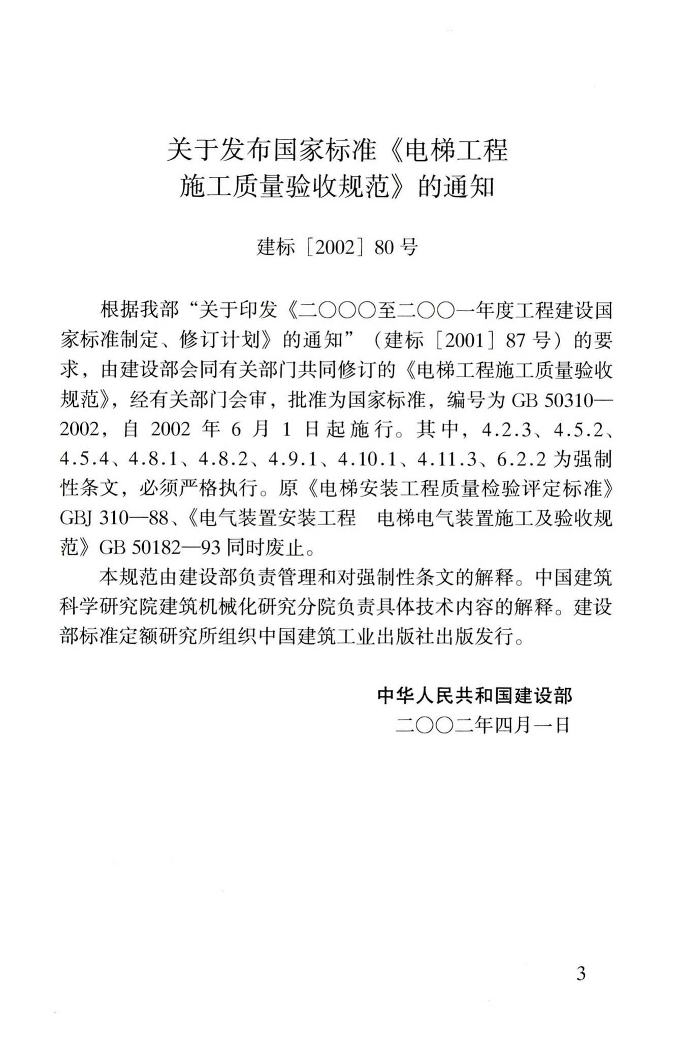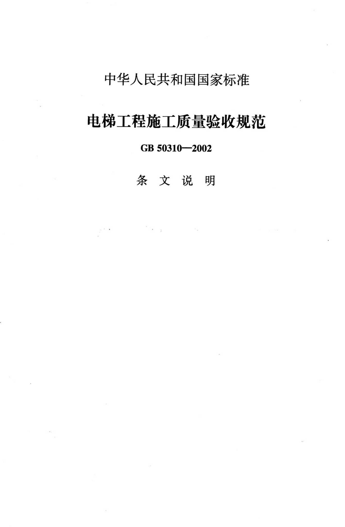 GB50310-2002《电梯工程施工质量验收规范》(含条文说明),替代GBJ310-88、GB50182-93,2002年04月01日发布,2002年06月01日实施,中国建筑工业出版社出版。