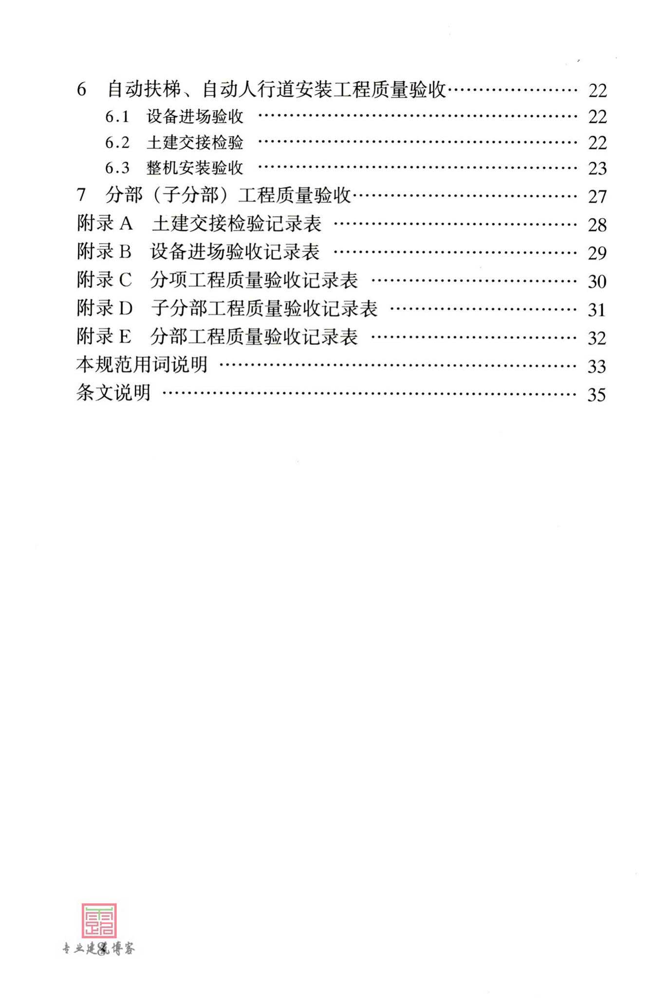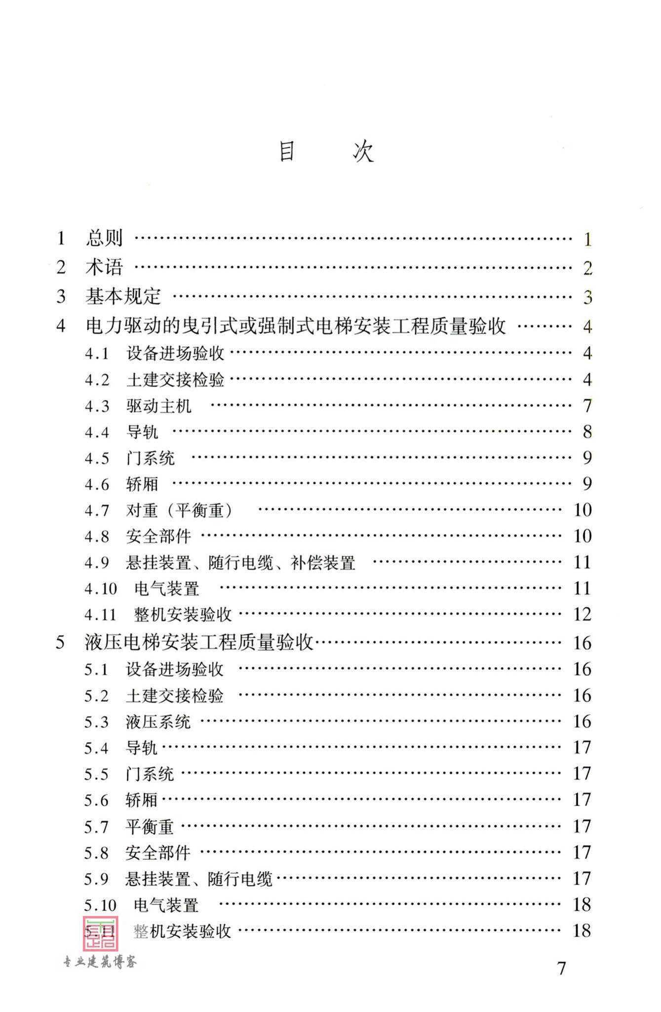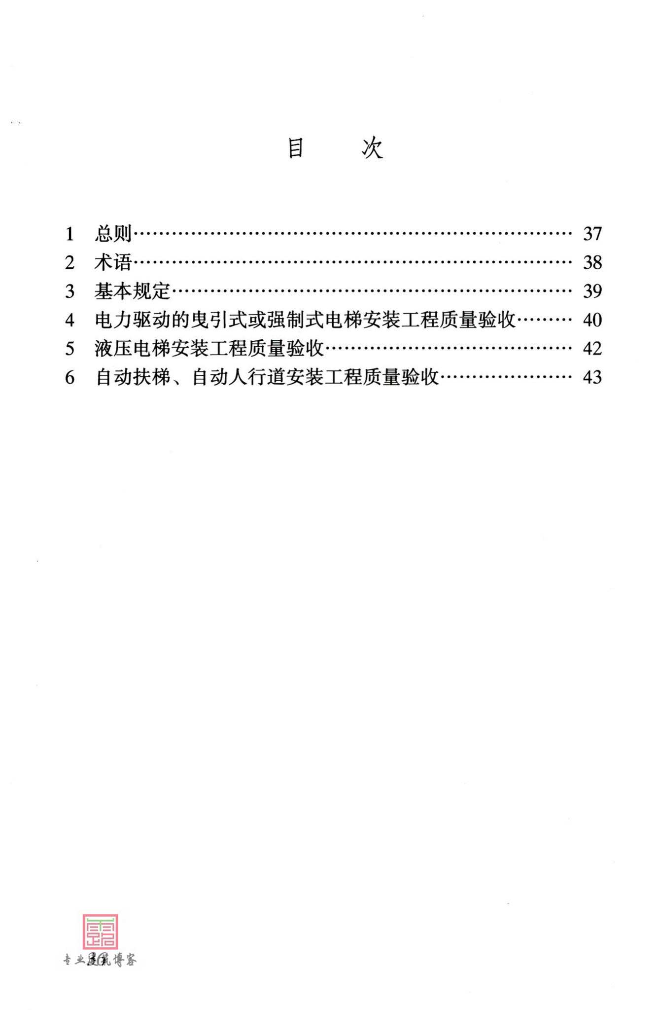 本规范主要技术内容包括:1、总则;2、术语;3、基本规定;4、电力驱动的曳引式或强制式电梯安装工程质量验收;5、压电梯安装工程质量验收;6、自动扶梯、自动人行道安装工程质量验收;7、分部(子分部)工程质量验收,共7部分组成。