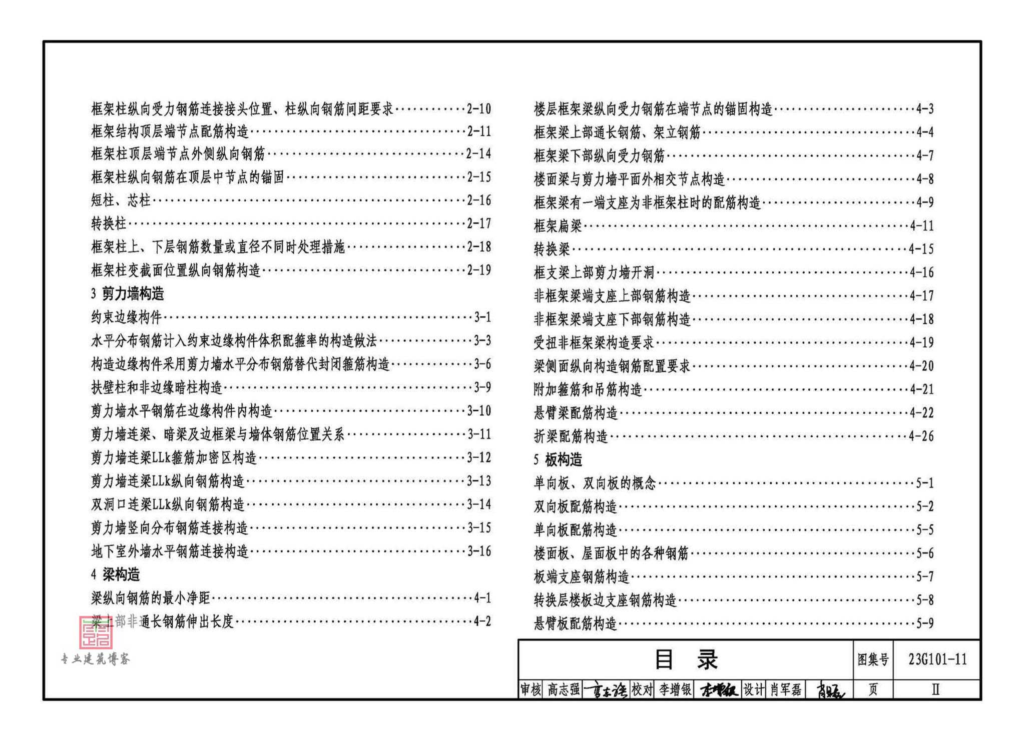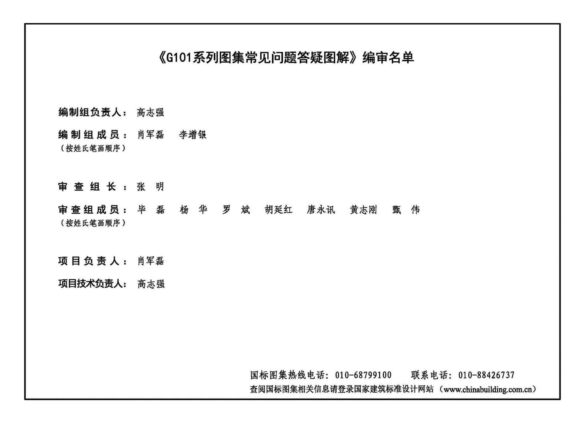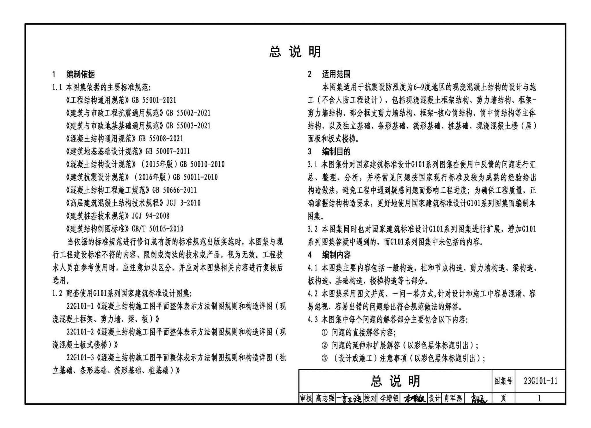 3、本图集针对国家建筑标准设计G101系列图集在使用中反馈的问题进行汇总、整理、分析,并将常见问题按国家现行标准及较为成熟的经验给出构造做法,避免工程中遇到疑感问题而影响工程进度;为确保工程质量,正确掌握结构构造要求,更好地使用国家建筑标准设计G101系列图集而编制本图集。