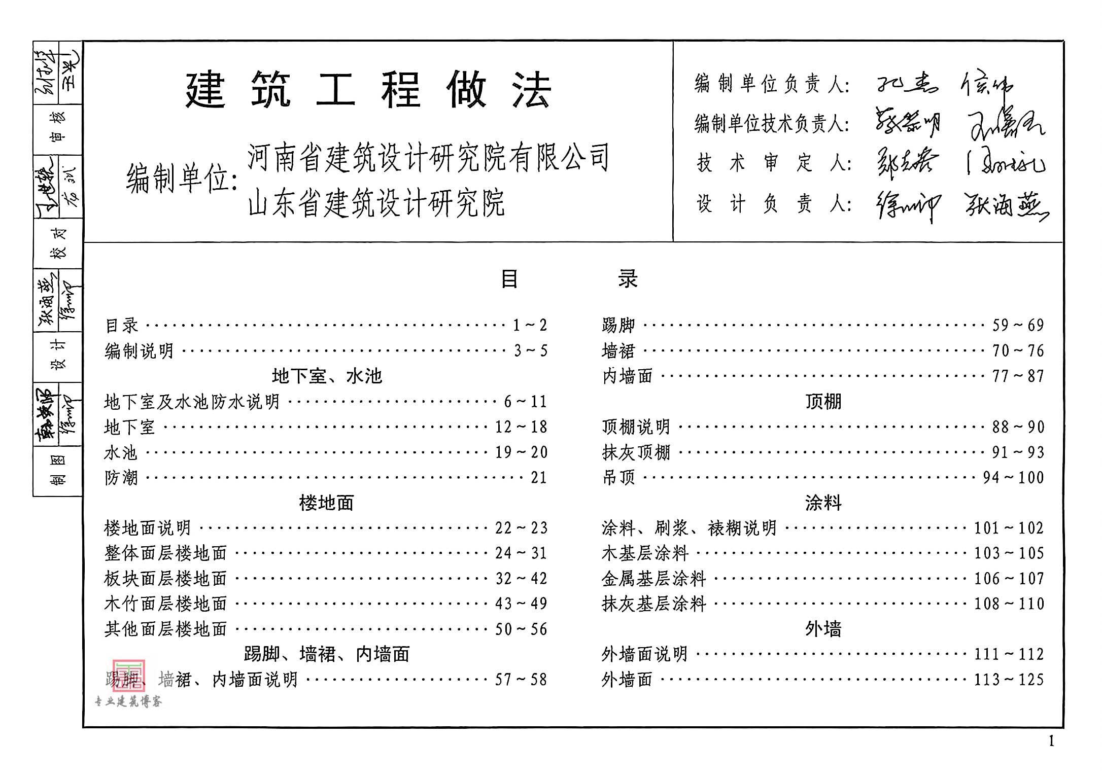 本图集包括地下室及水池防水,楼地面,踢脚、墙裙、内墙,顶棚、涂料、刷浆、裱糊,外墙,屋面,散水、台阶、坡道,道路、场地等九个分部的构造用料做法。