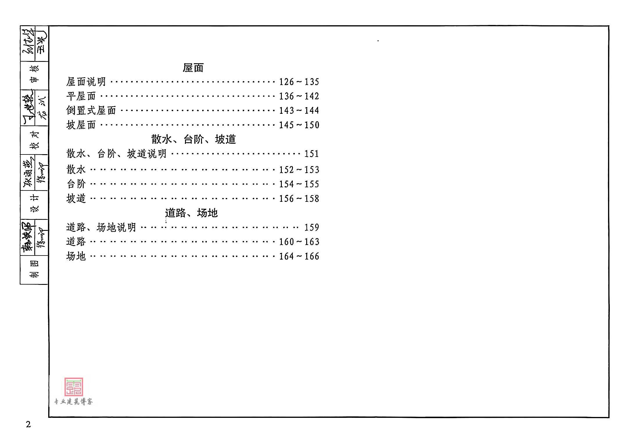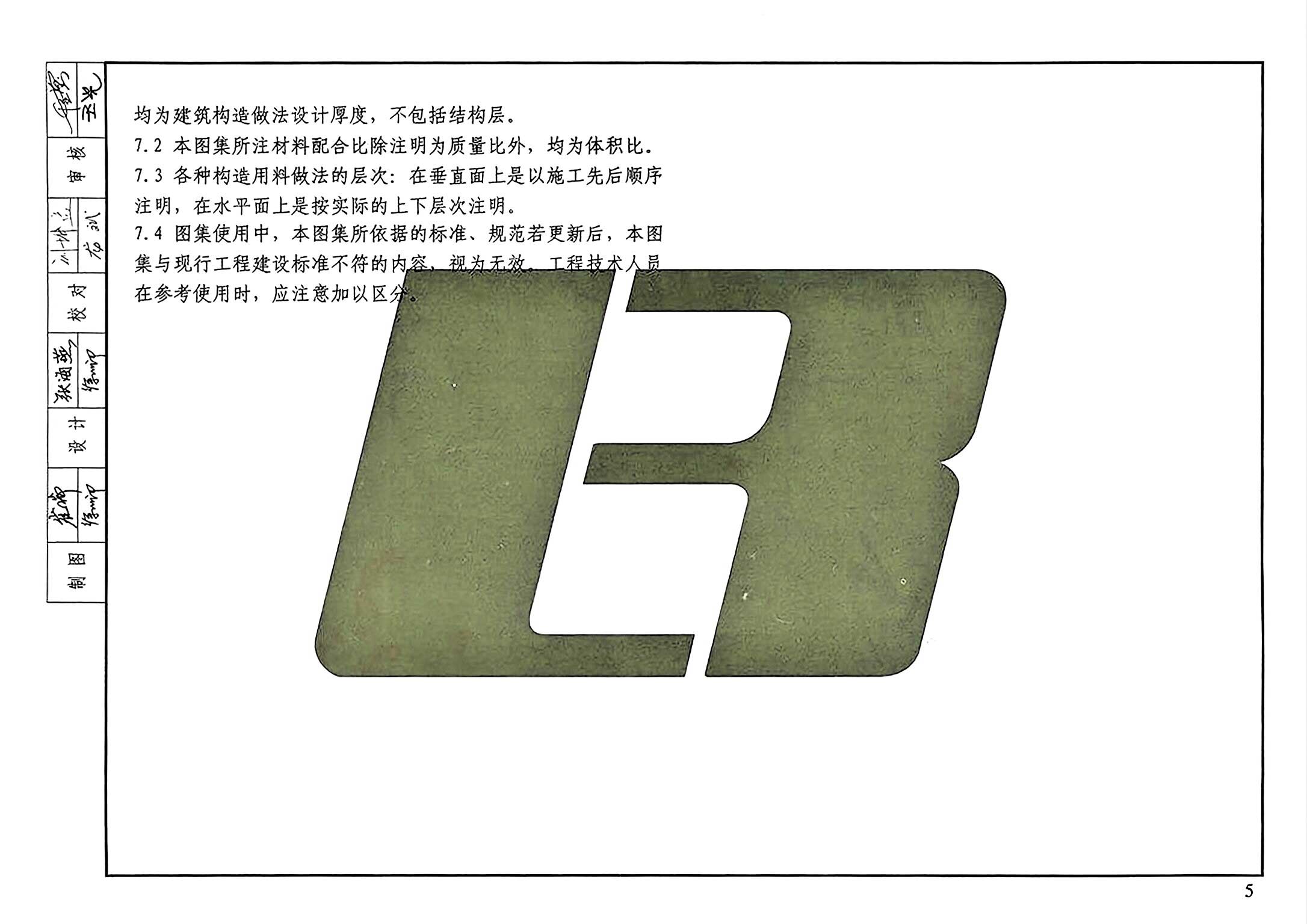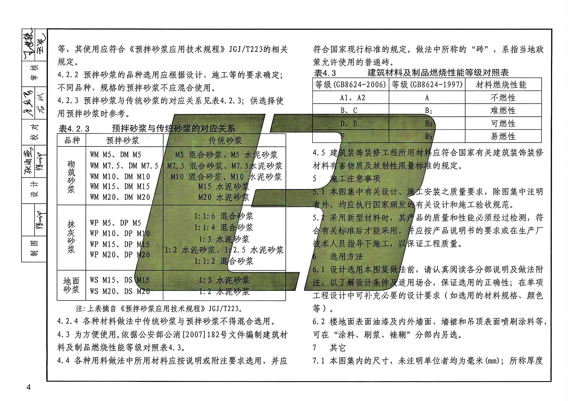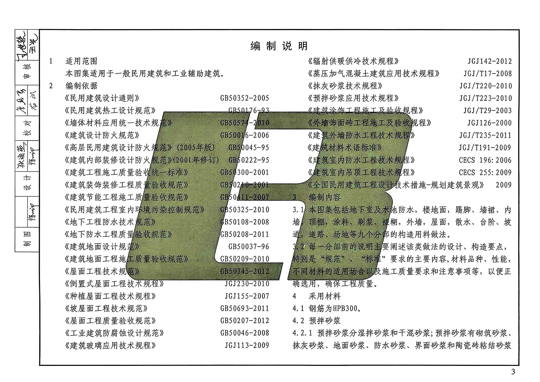 每一分部前的说明主要阐述该类做法的设计、构造要点,特别是“规范”、“标准”要求的主要内容,材料品种、性能,不同材料的适用场合以及施工质量要求和注意事项等,以便正确选用,确保工程质量。