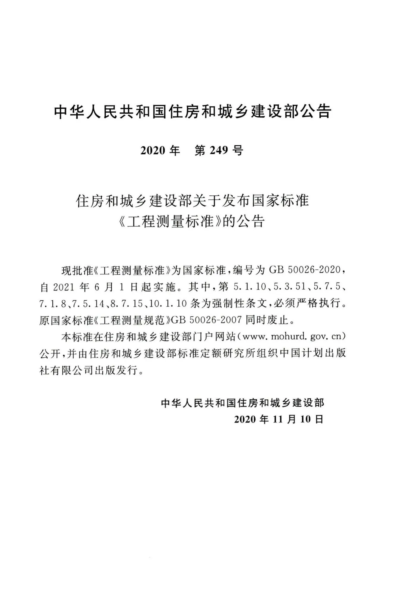 GB50026-2020《工程测量标准》,替代GB50026-2007,2020年11月10日发布,2021年06月01日实施,中国计划出版社出版。