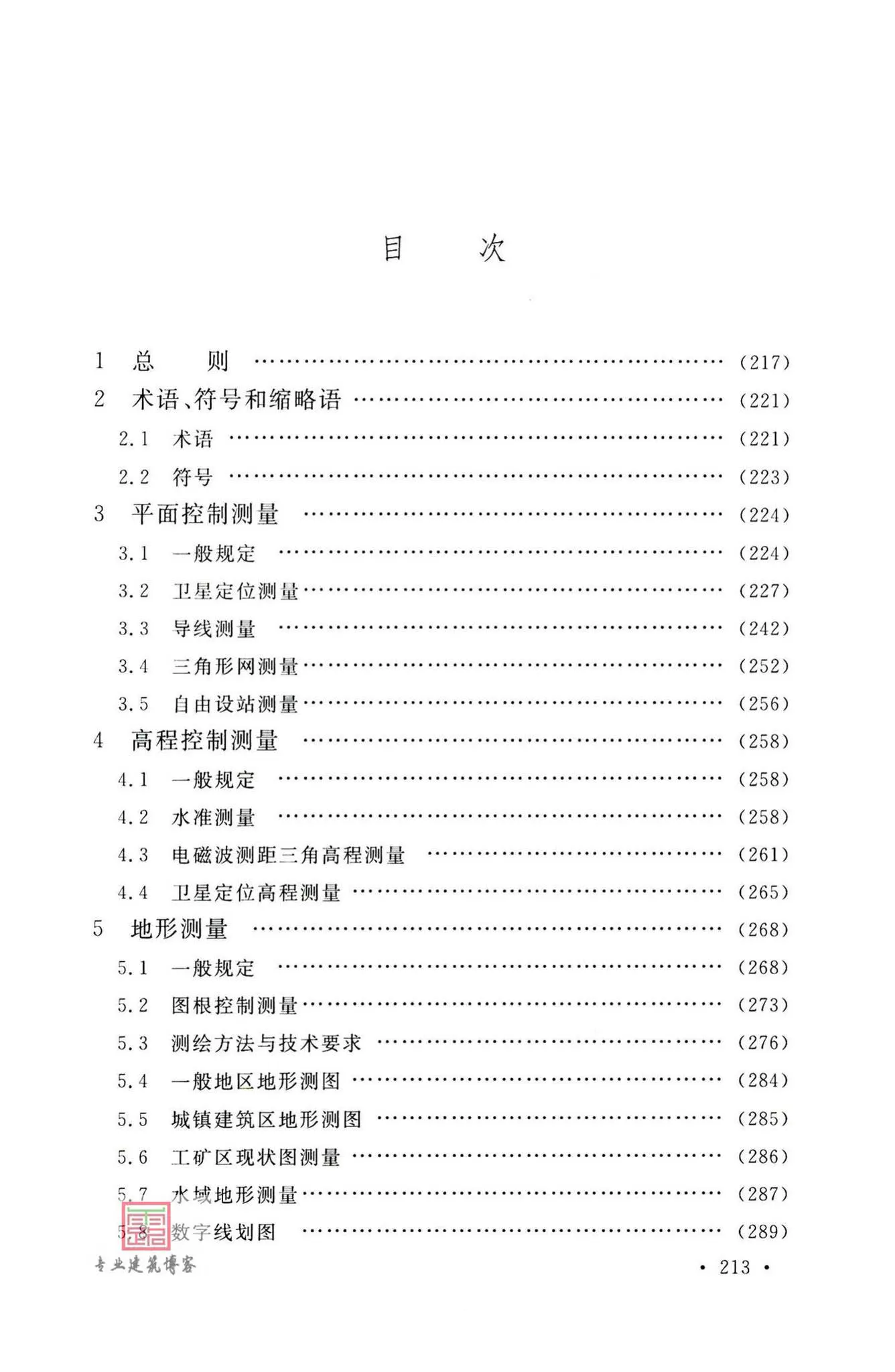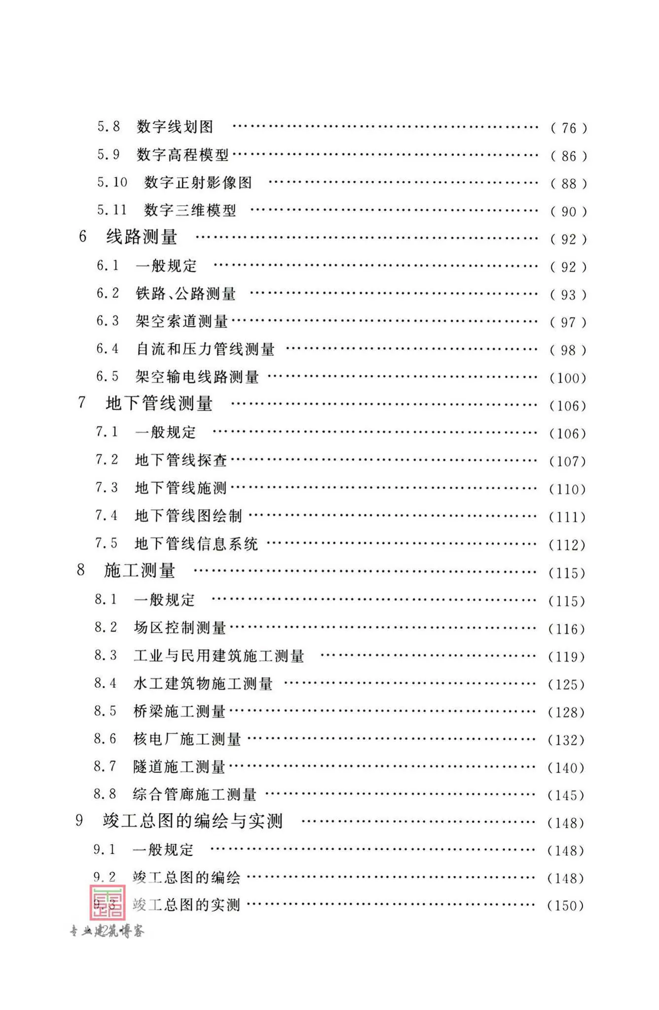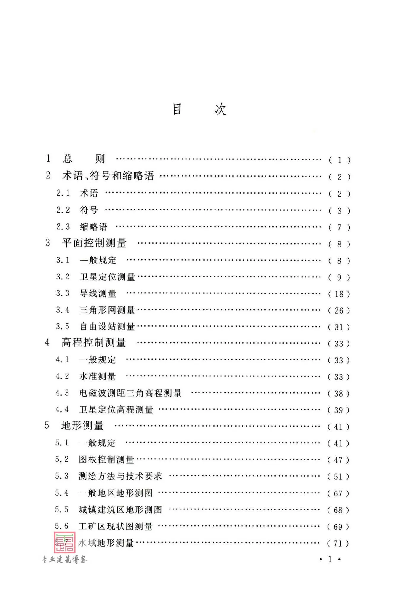本标准的主要技术内容是:总则,术语、符号和缩略语,平面控制测量,高程控制测量,地形测量,线路测量,地下管线测量,施工测量,竣工总图的编绘与实测,变形监测等。