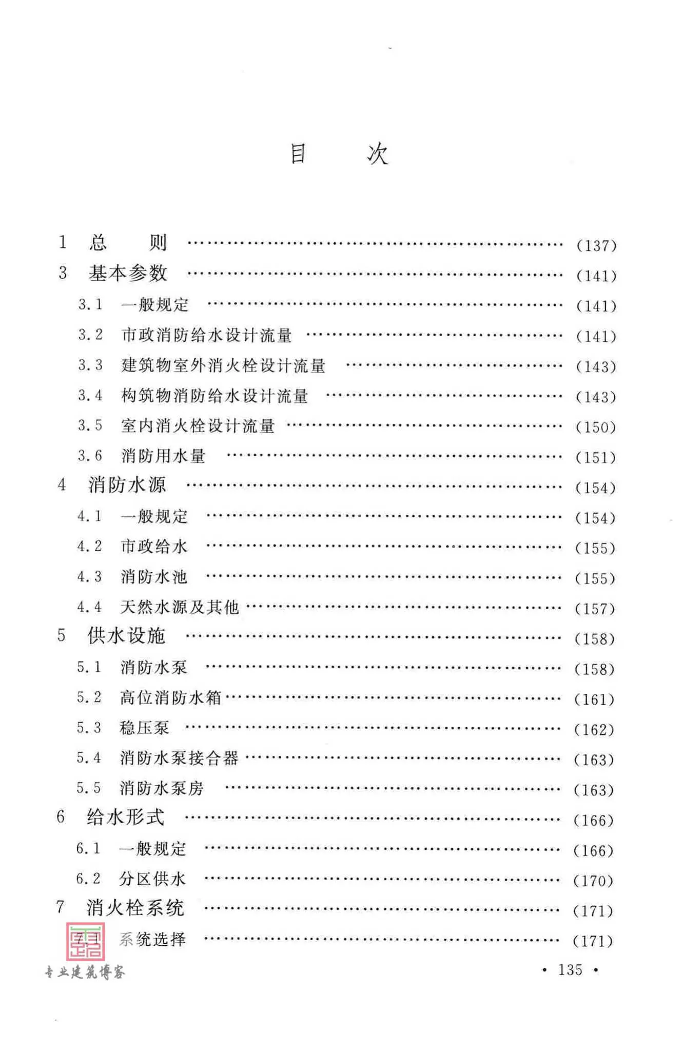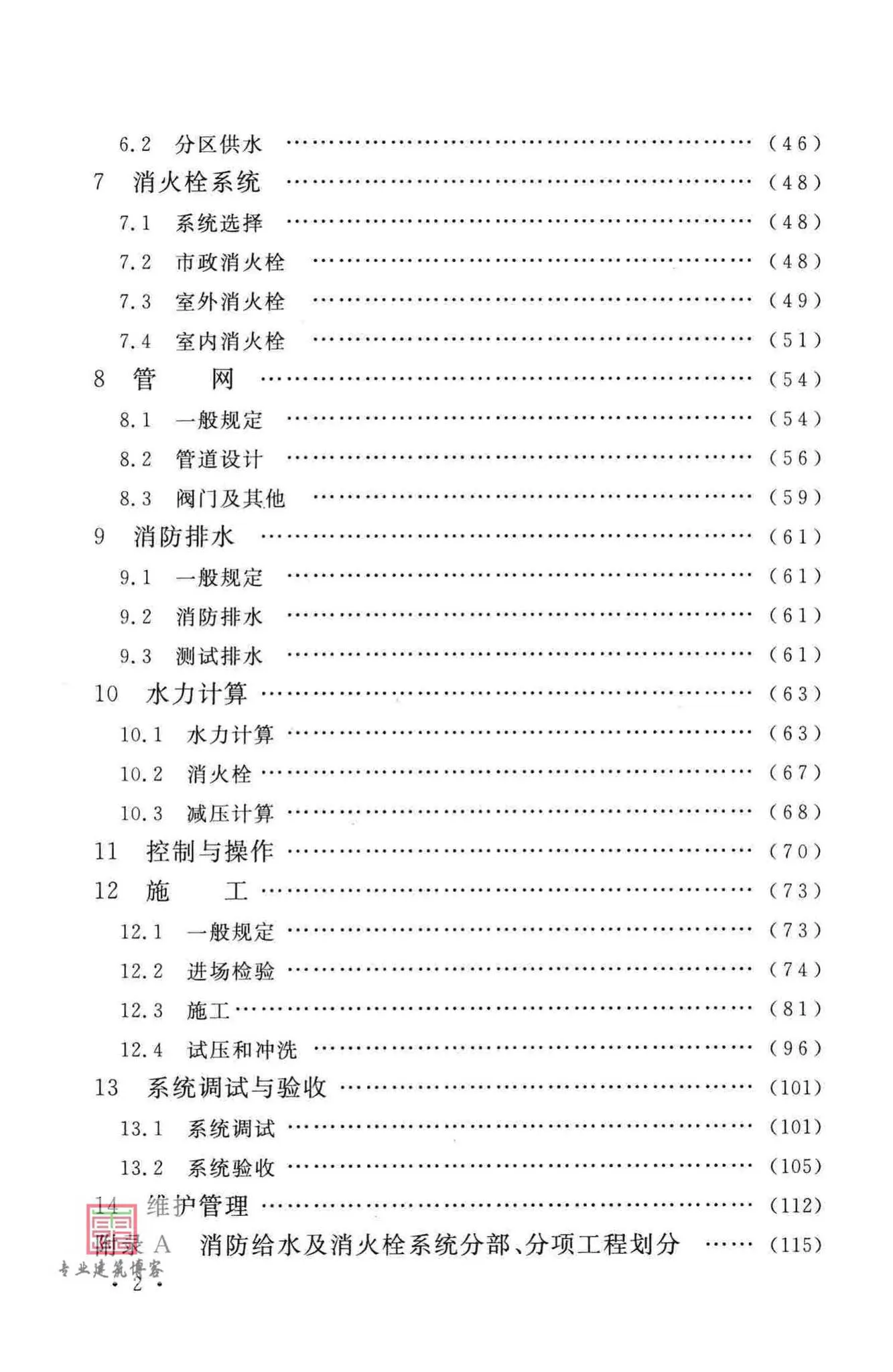 本规范共分14章和7个附录,主要内容包括:总则、术语和符号、基本参数、消防水源、供水设施、给水形式、消火栓系统、管网、消防排水、水力计算、控制与操作、施工、系统调试与验收、维护管理等。