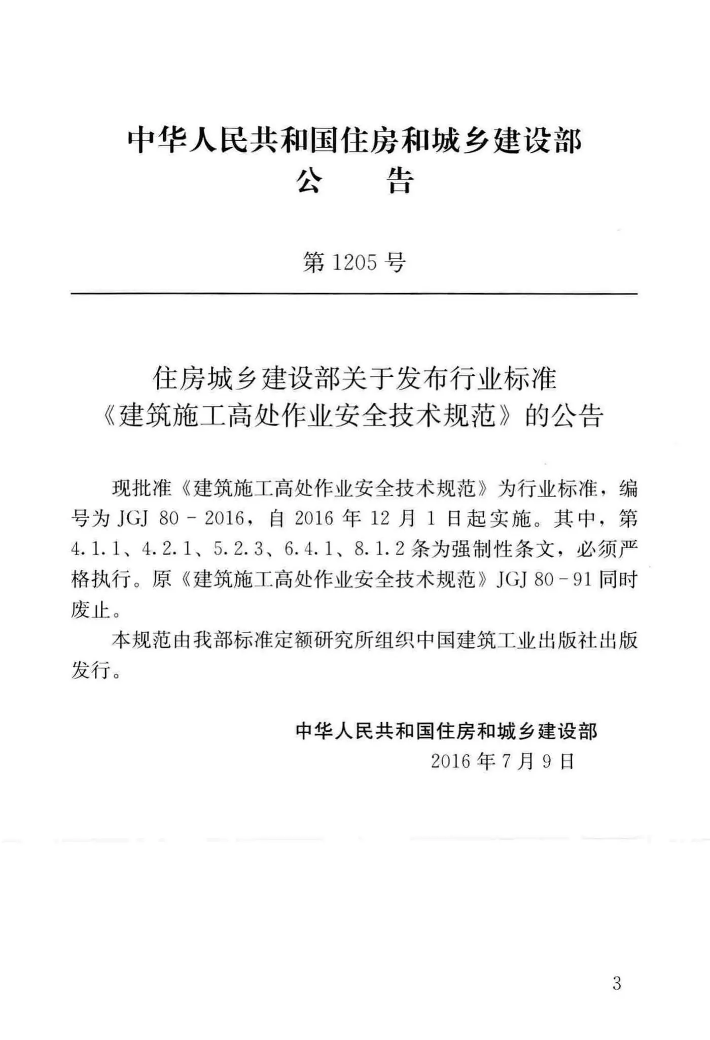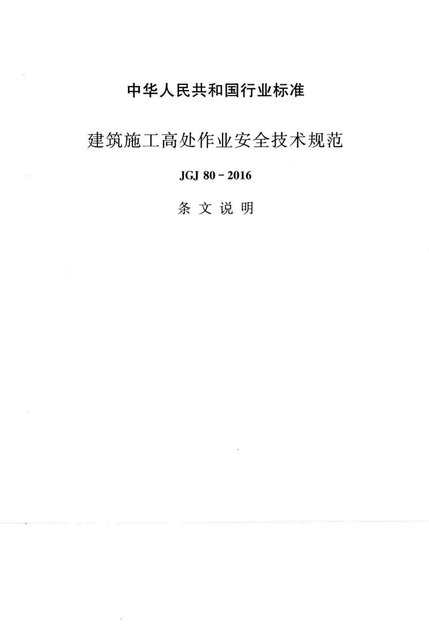 JGJ80-2016《建筑施工高处作业安全技术规范》,替代JGJ80-91,2016年07月09日发布,2016年12月01日实施,中国建筑工业出版社出版。