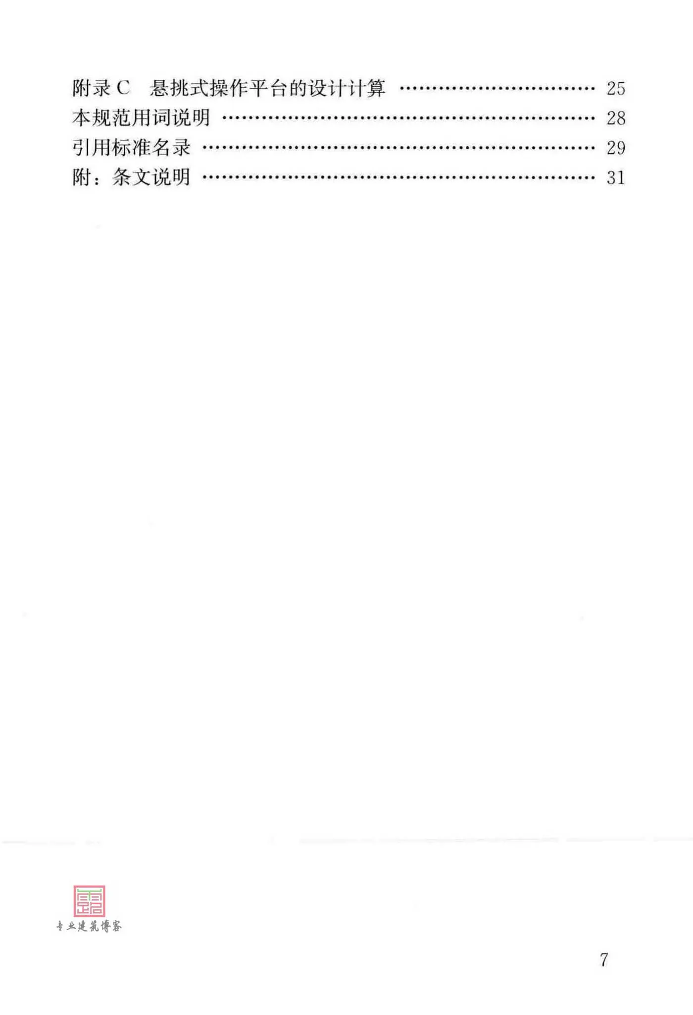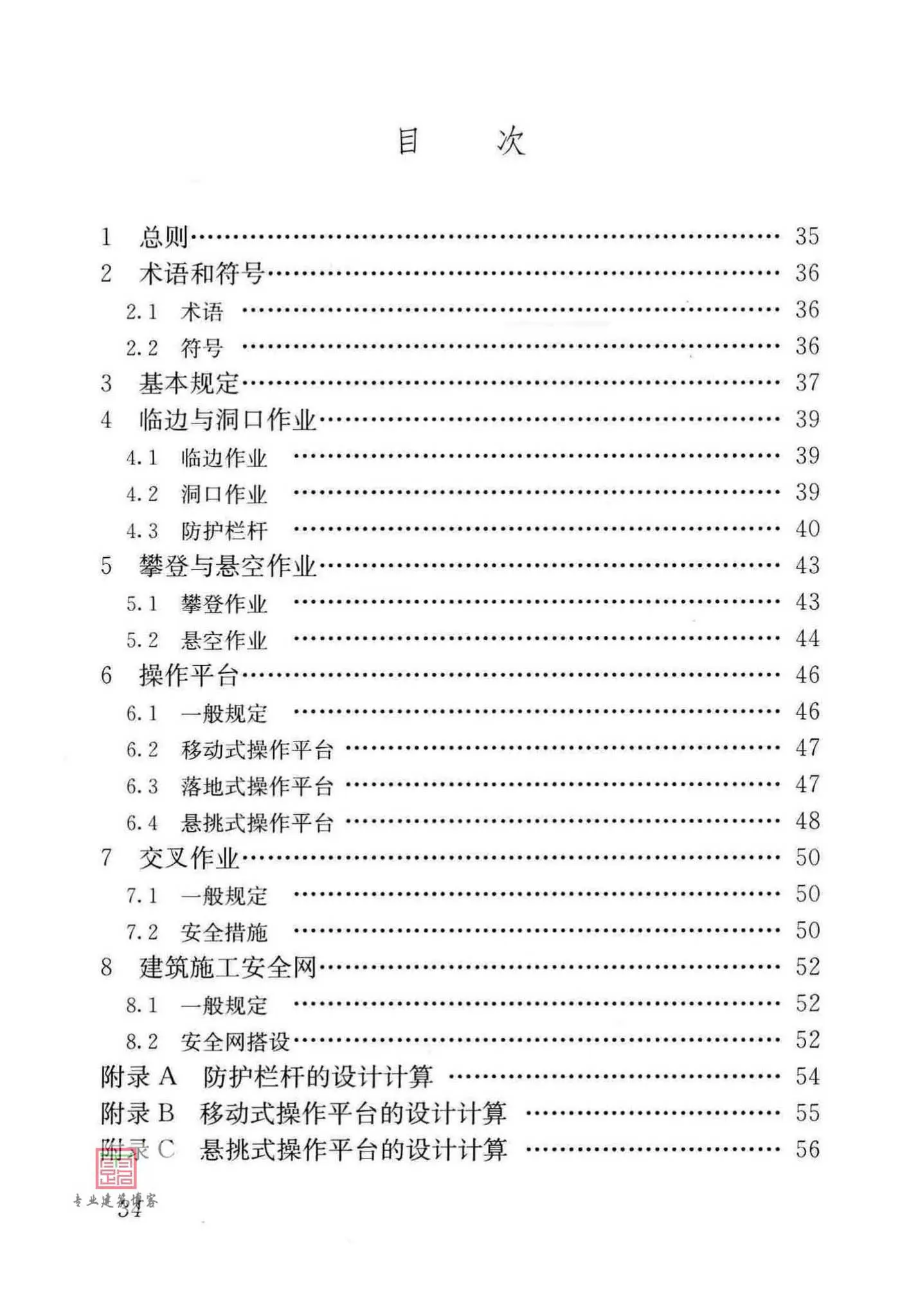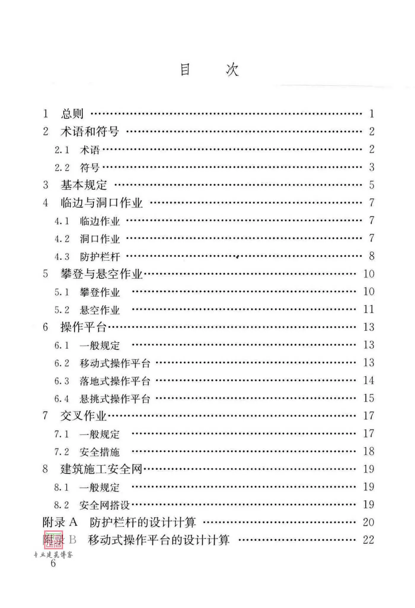 本规范的主要技术内容是:1、总则;2、术语和符号;3、基本规定;4、临边与洞口作业;5、攀登与悬空作业;6、操作平台;7、交叉作业;8、建筑施工安全网。