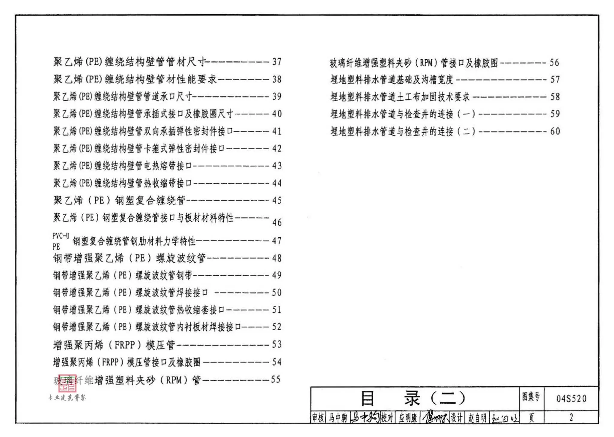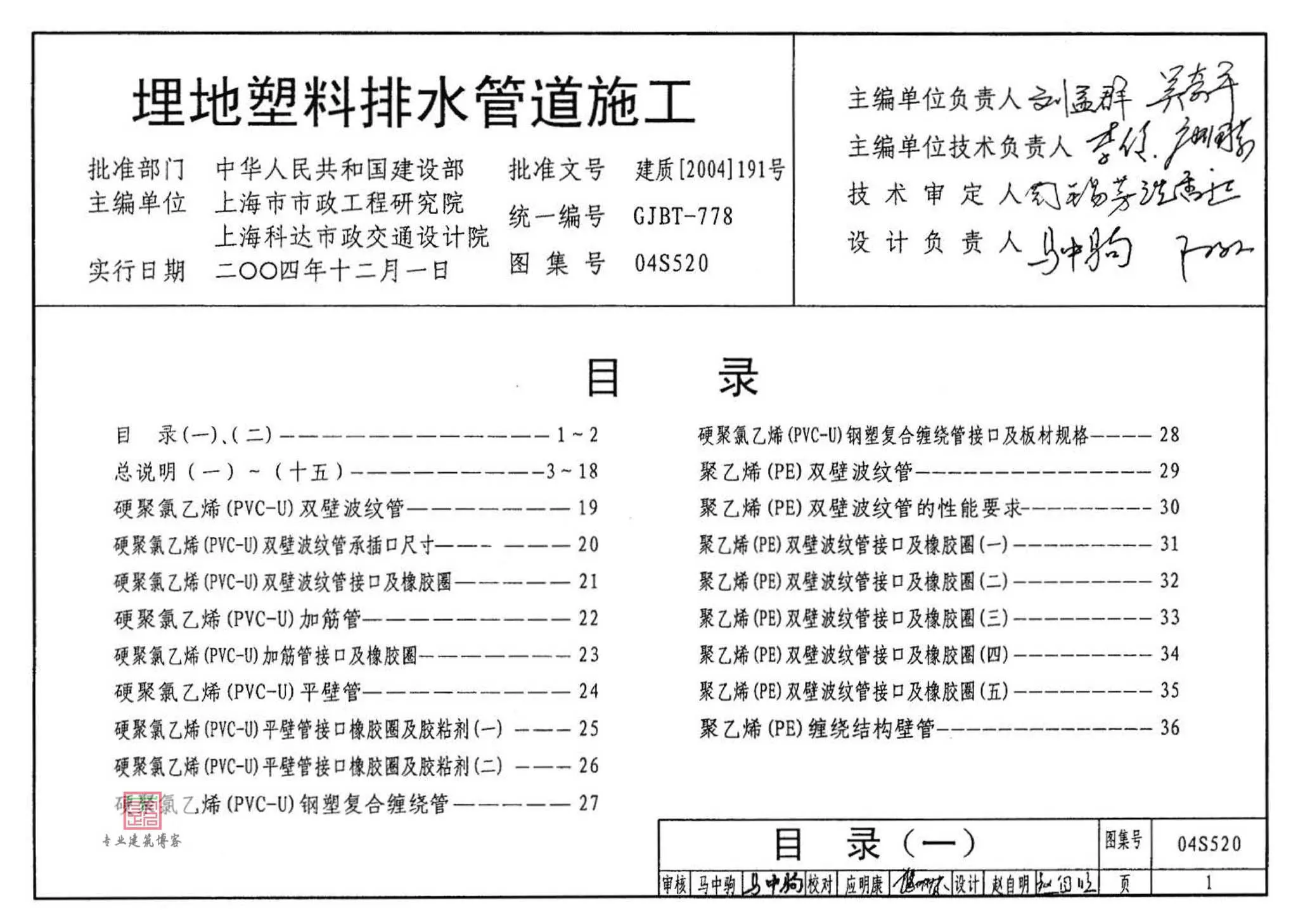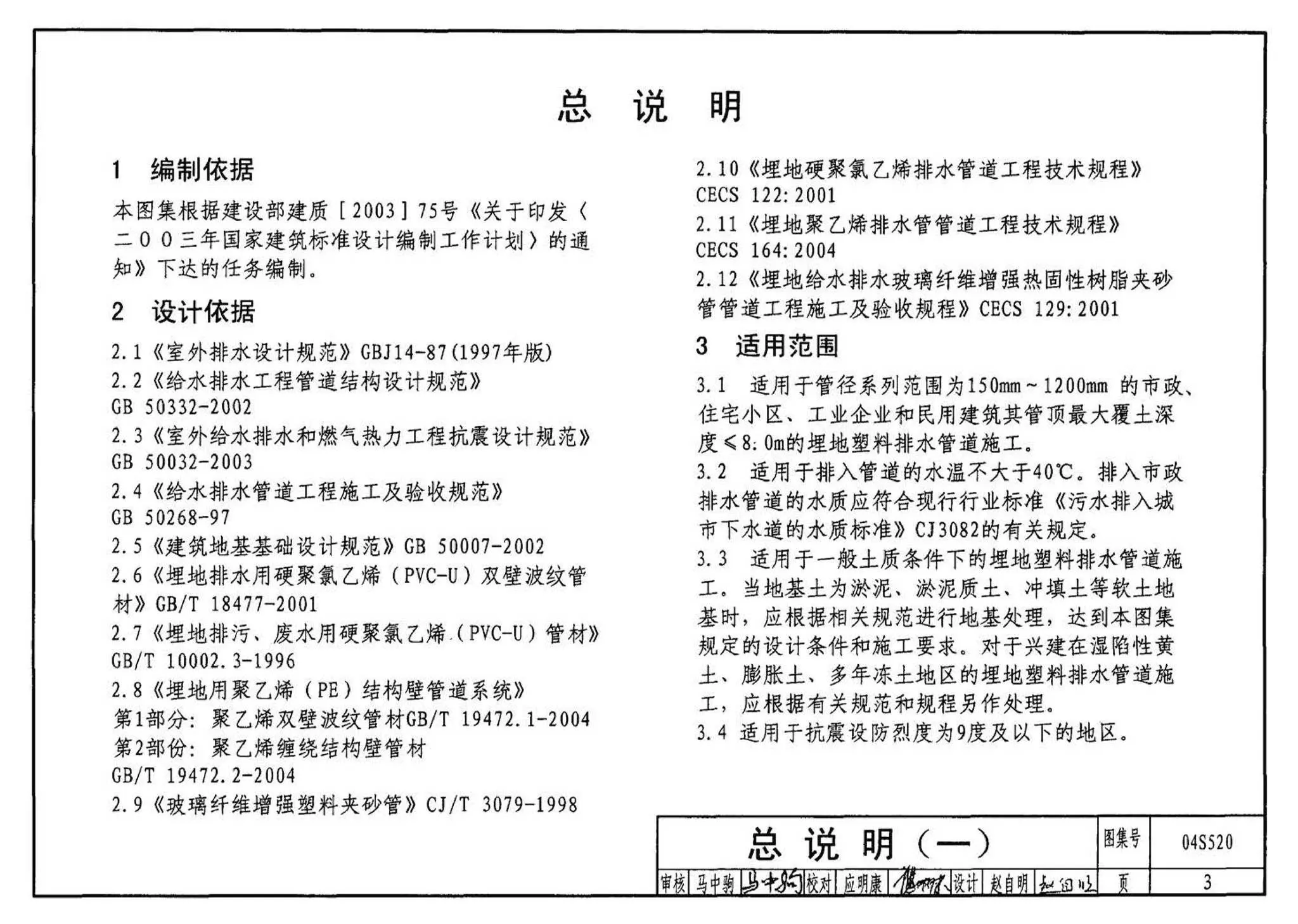 04S520《埋地塑料排水管道施工》,2004年11月08日发布,2004年12月01日实施,中国计划出版社出版。